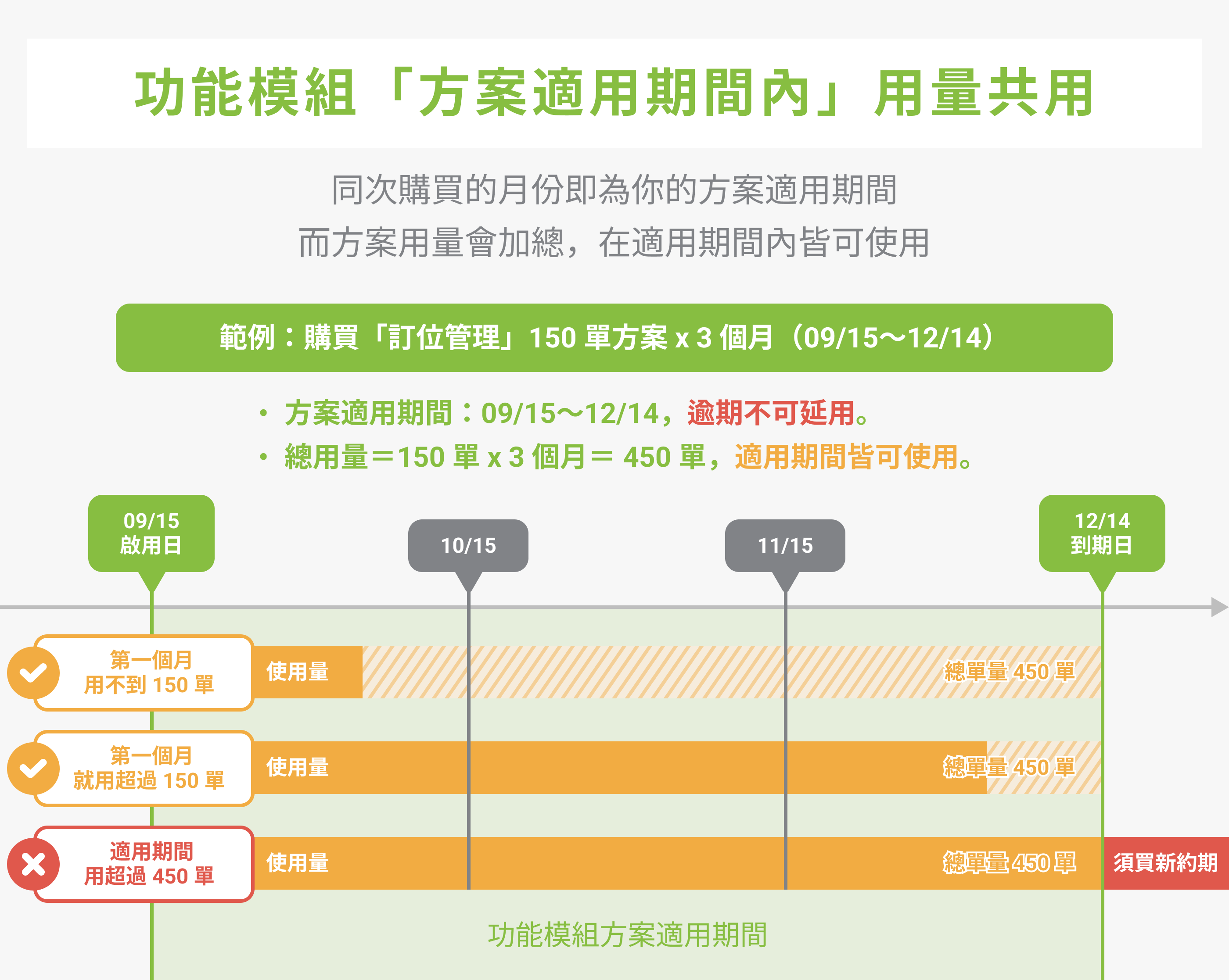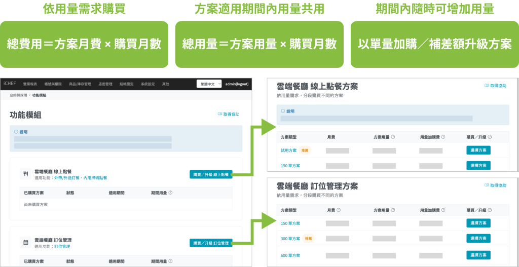 - 模組方案用量無法「跨功能模組」使用(例如:線上點餐與訂位管理須分別購買)。