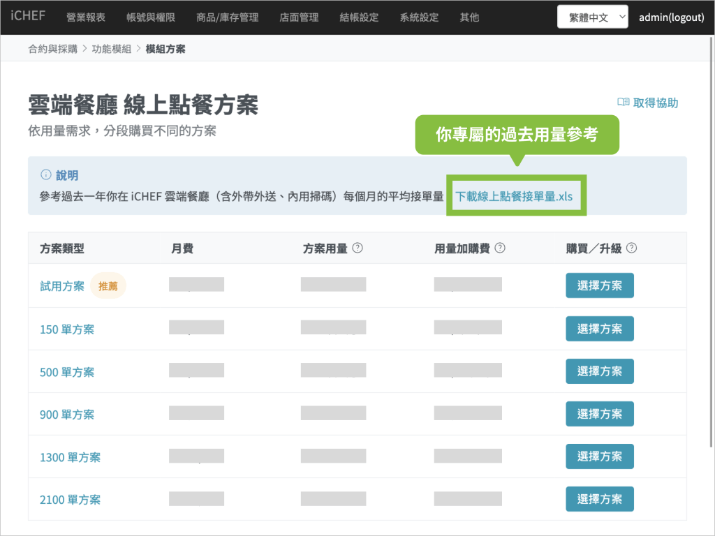 iCHEF 功能模組方案以用量為級距拆分,你可以依照過往的需求量評估要選擇的方案,再直接到後台模組頁面點選,讓系統自動幫你試算總費用。