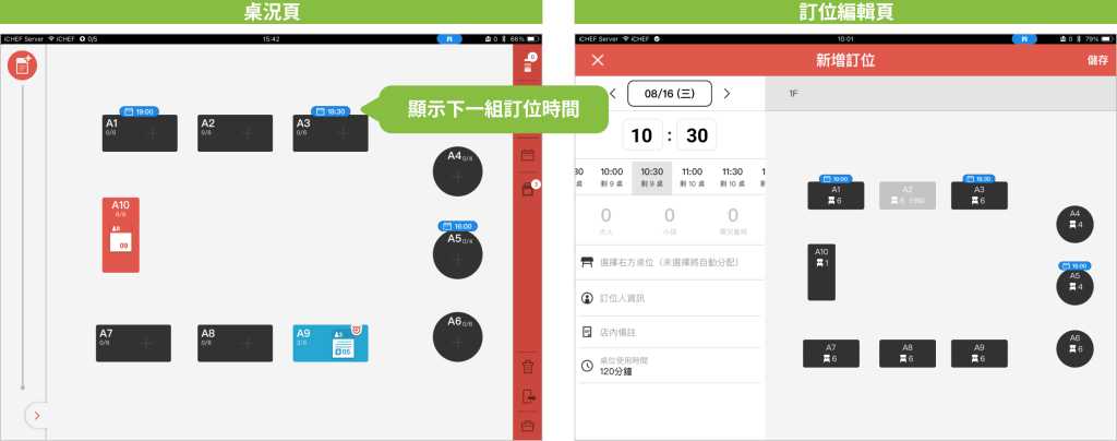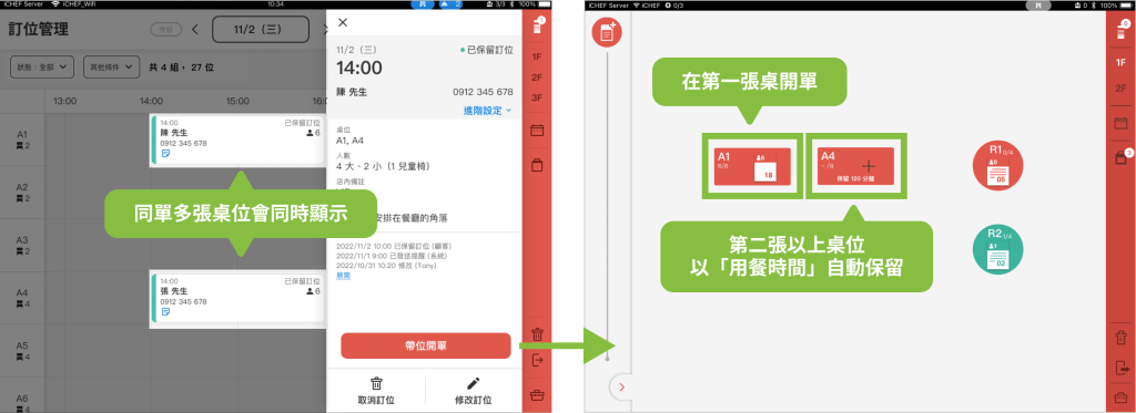 當同一組訂位安排兩張以上桌子時「帶位開單」,系統會將顧客單開在第一桌子上,並同步將第二張以上桌子依「用餐時間」自動保留桌位,讓你在接待或新增訂位時不會超收客人。而依現場狀況,你仍可「長按」取消保留。