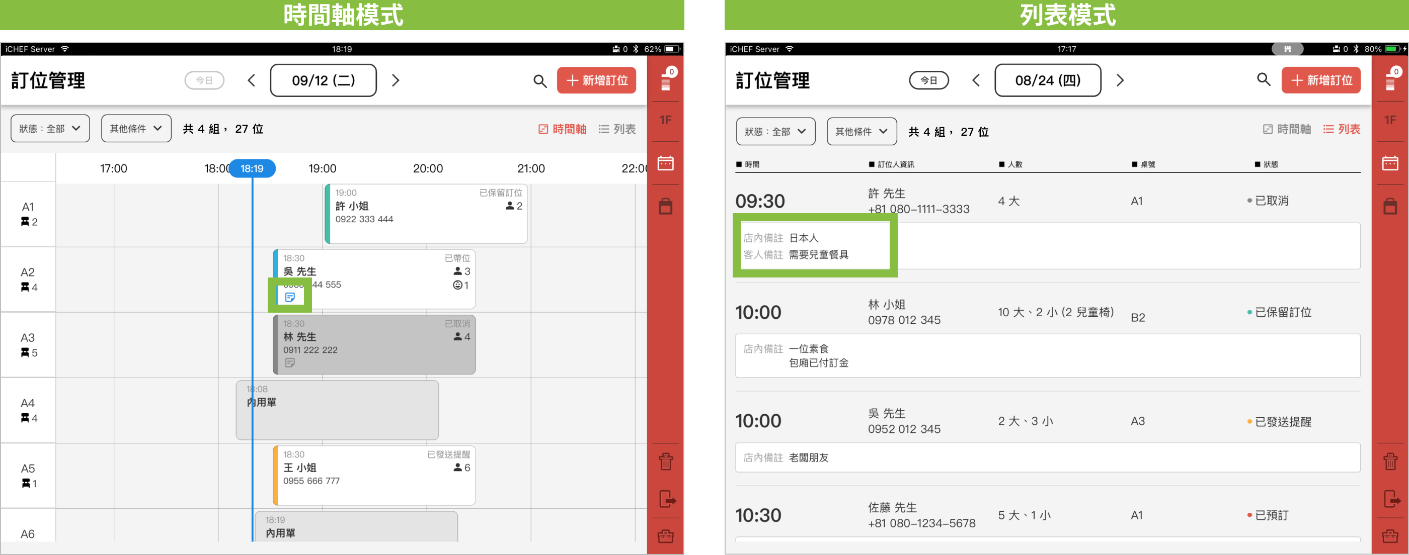 訂位單中可包含由 iCHEF POS App 輸入的「店內備註」與消費者訂位時輸入的「客人備註」,有輸入時才會顯示於訂位頁面中。