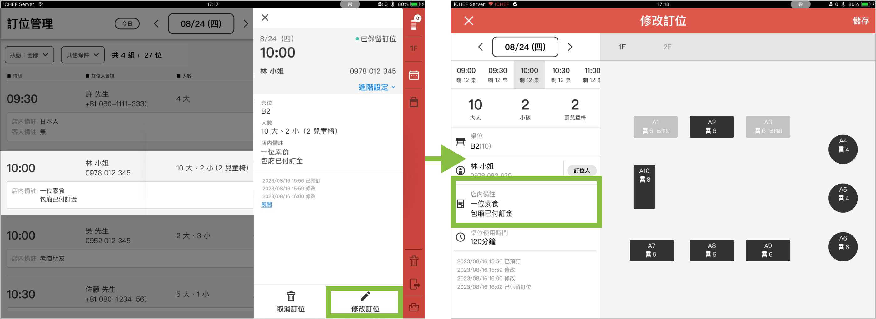 - 輸入與修改位置:iCHEF POS App 訂位資訊「訂位備註」編輯。