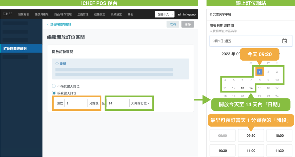 • 開放訂位區間設定:「接受當天訂位」開放 1 分鐘後,至 14 天內的訂位