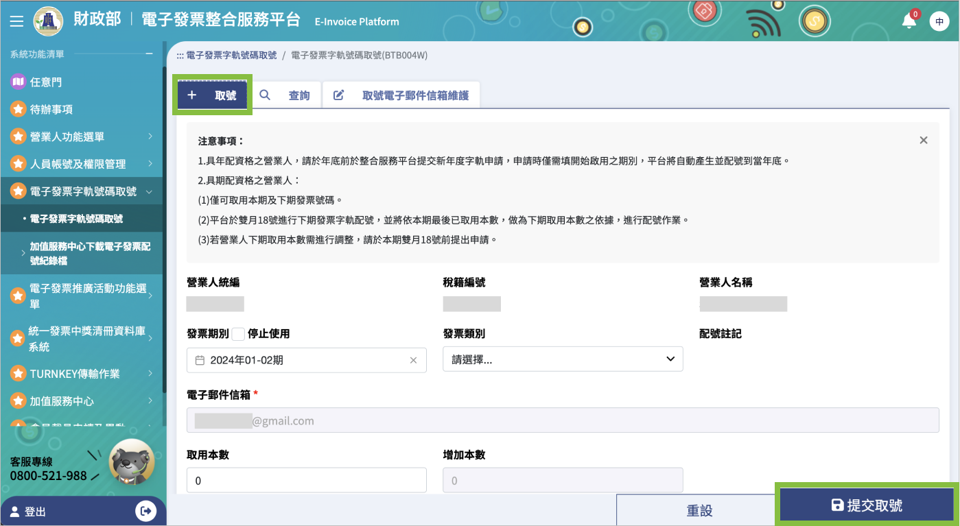 - 點選左側選單 電子發票字軌號碼取號 > 電子發票字軌號碼取號