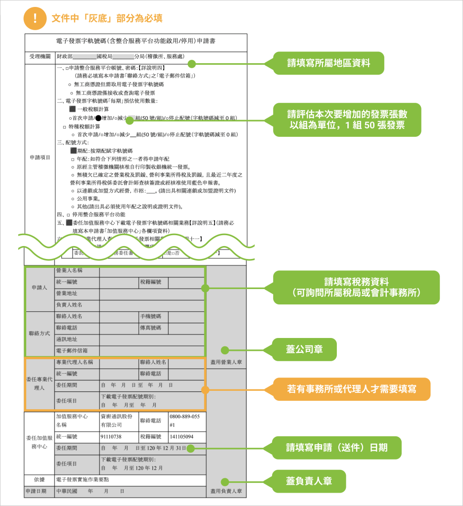 請下載字軌申請書,並參考圖示填寫。完成並用印後,建議親自送交所屬稅局,告知因字軌即將不足需要多申請電子發票字軌,請所屬稅局儘速配號。