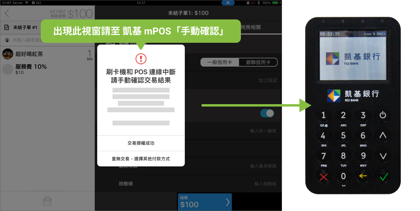 使用 iCHEF POS 可以整合凱基 mPOS 刷卡機收款,但因環境或設備因素可能導致連線中斷,交易結果無法回傳給 iCHEF POS。