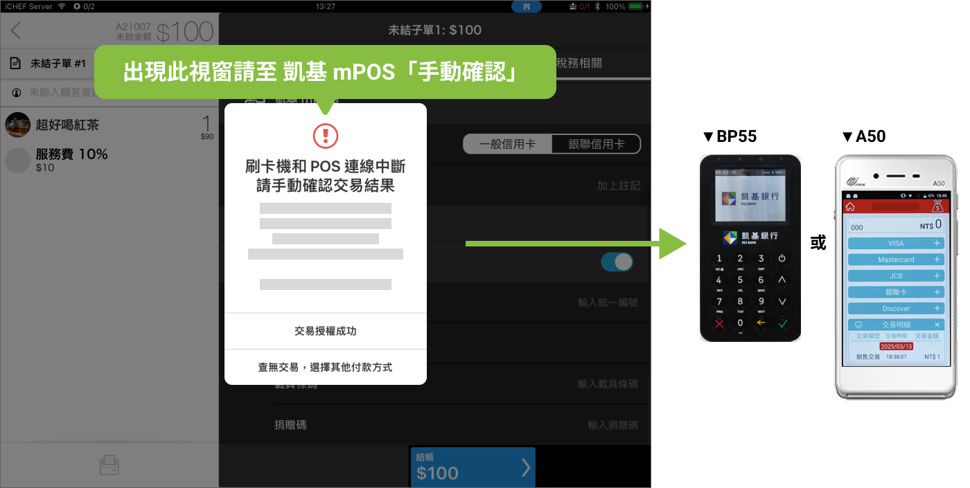 請依照凱基 mPOS 刷卡機顯示的交易狀態,在 iCHEF POS App 手動確認交易視窗中選擇。