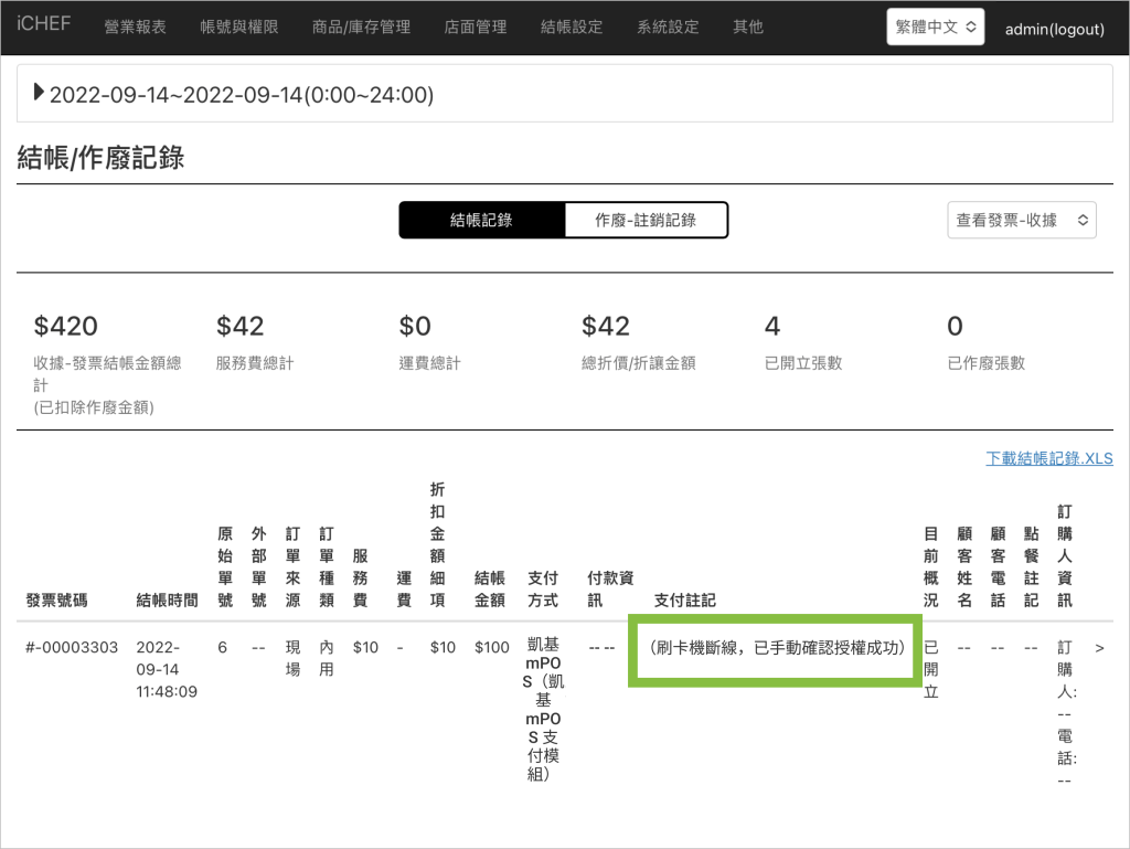 - 有「授權成功」紀錄:請在 iCHEF POS App 點選「交易授權成功」,完成結帳。