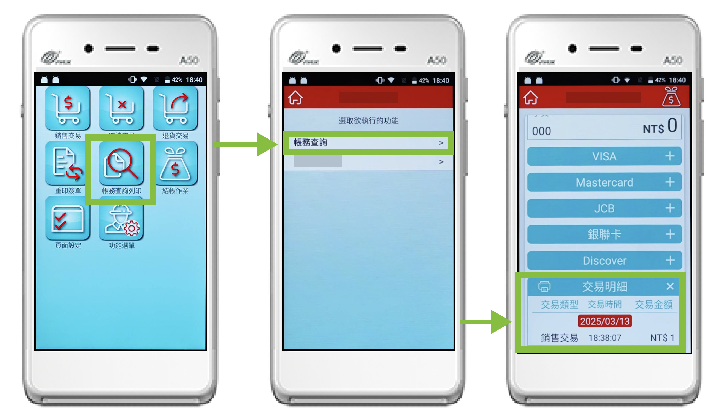 - 若需查詢其它時間點的交易,可以按刷卡機的「︿」或「﹀」查看