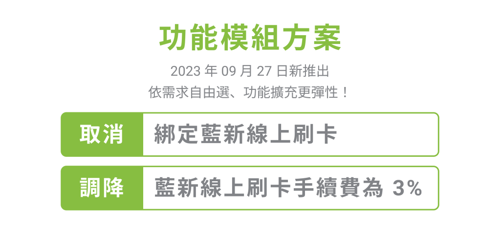 | 購買功能模組方案 | ✔ 功能可繼續使用 「取消」綁定藍新線上刷卡。 「調降」藍新線上刷卡手續費為 3%。 | ✔ 功能可繼續使用 「取消」綁定藍新線上刷卡。 「調降」藍新線上刷卡手續費為 3%。 |
