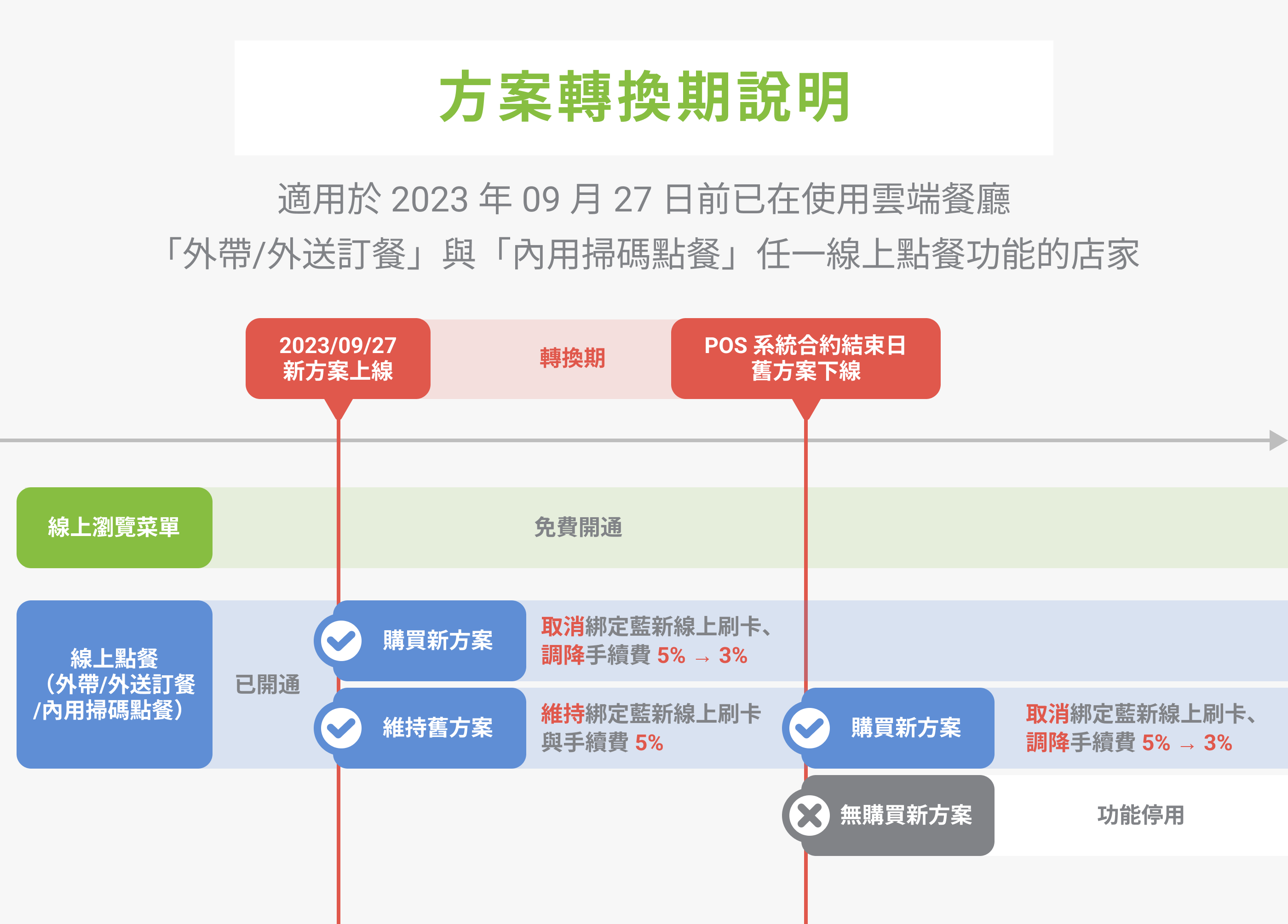 - 當期 POS 合約結束後:舊方案下線,使用「外帶/外送訂餐」、「內用掃碼點餐」功能須先購買【雲端餐廳 線上點餐】功能模組。