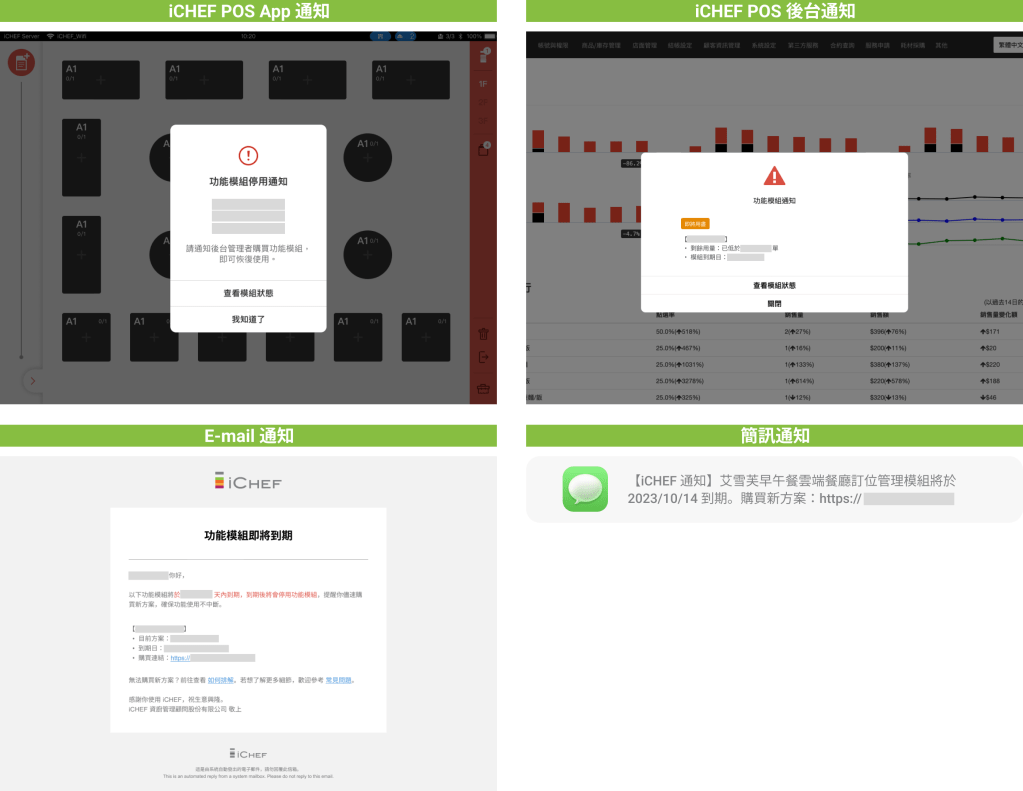 | 到期當天 | E-mail、簡訊、後台、POS | 若到期後無購買新方案,該模組功能將停用。 |