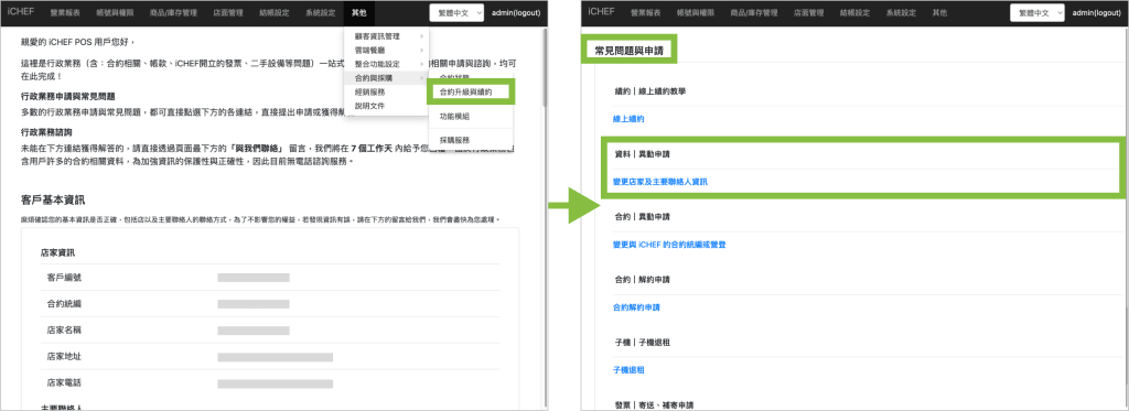 E-mail 與簡訊會發送給店內 iCHEF 合約中的「主要聯絡人」,若希望變更主要聯絡人,請依以下步驟申請變更: