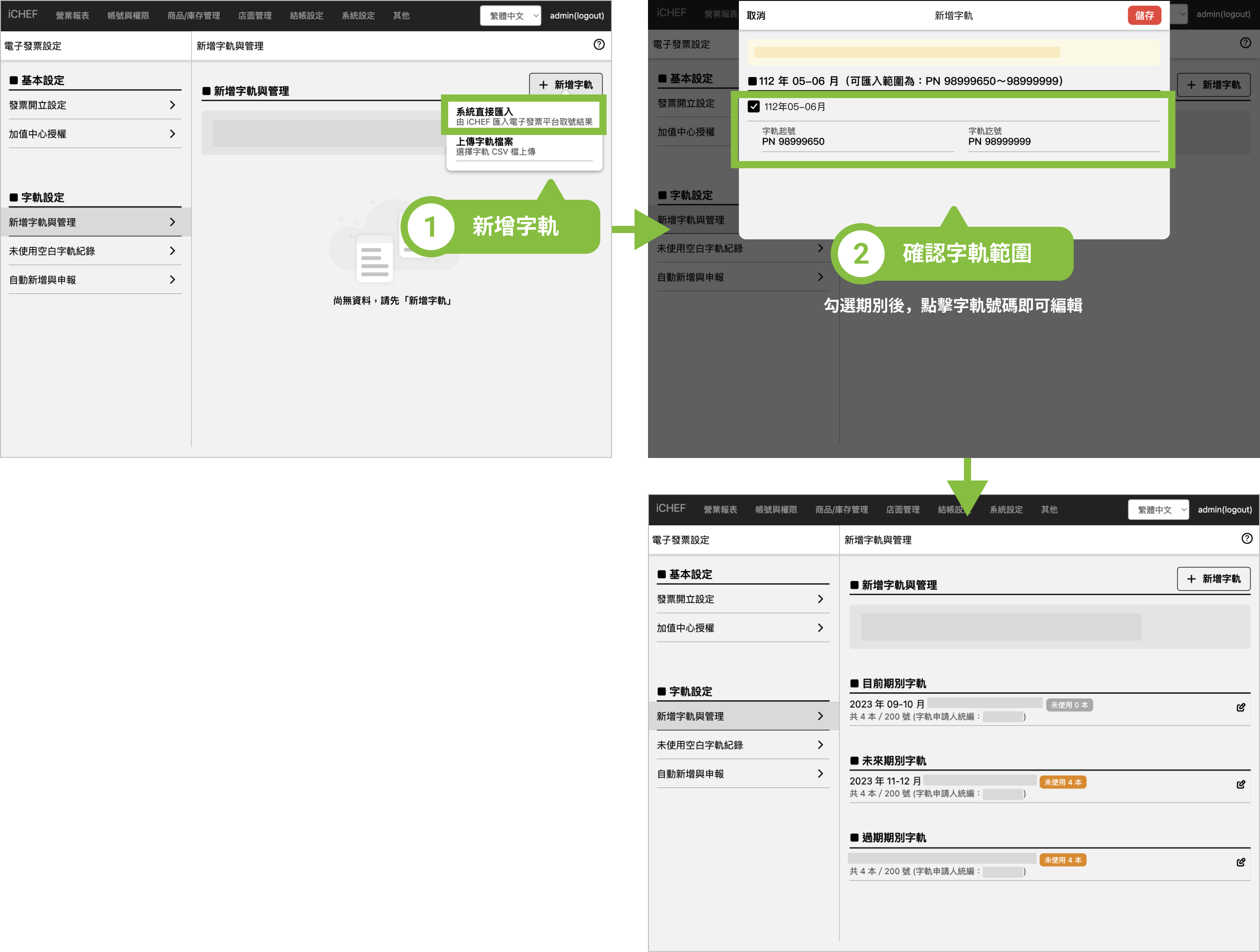 若選擇「系統直接匯入」的方式新增字軌,須先完成 iCHEF 加值中心授權,後續每期即可直接在 iCHEF 後台匯入電子發票平台取號結果,不用再於電子發票平台和 iCHEF 後台之間來回操作。