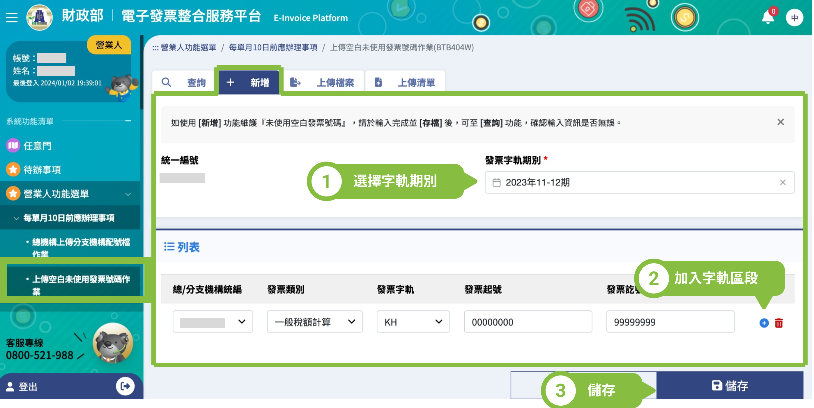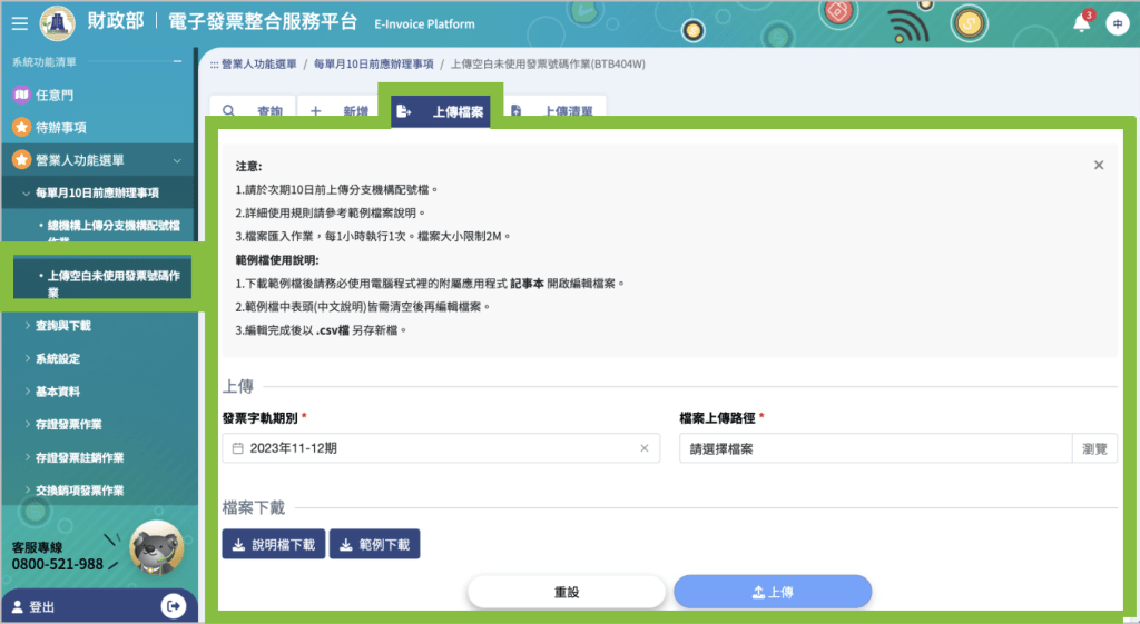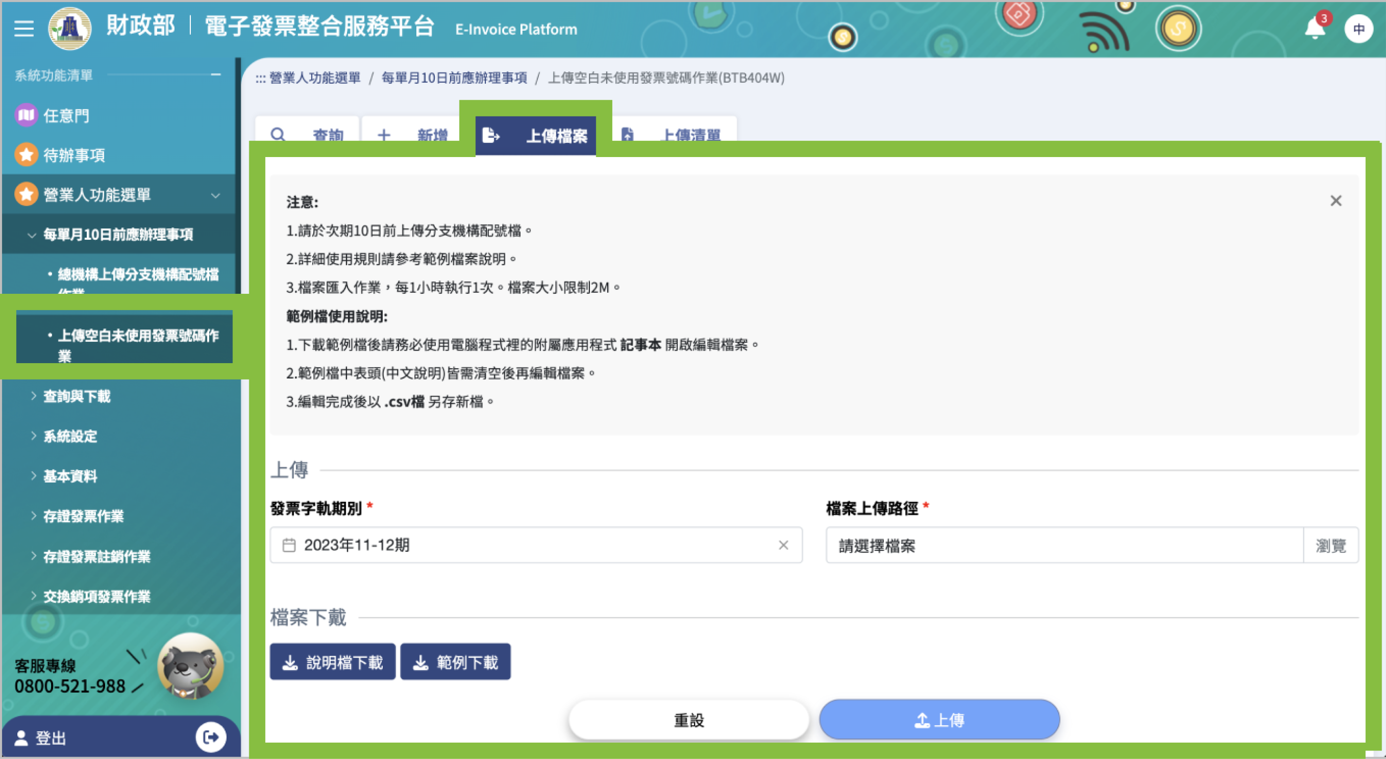 ➤ 操作位置:電子發票整合服務平台 > 營業人功能選單 > 每單月10日前應辦理事項 > 上傳空白未使用發票號碼作業