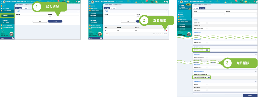 此情況為登入電子發票服務平台的帳號權限不足,請通知有權限的人進行未使用空白字軌上傳,或請平台最高權限人員透過以下的方式將權限授權給此登入帳號。