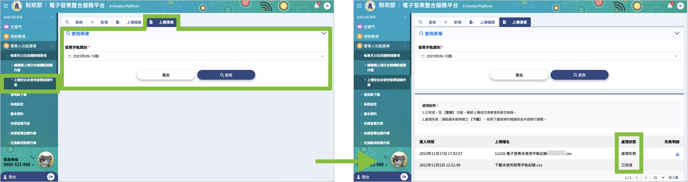 當處理完畢後,即可在電子發票整合服務平台「營業人功能選單 > 每單月10日前應辦理事項 > 上傳空白未使用發票字軌作業」中選擇「查詢」看到最終上傳資料紀錄。