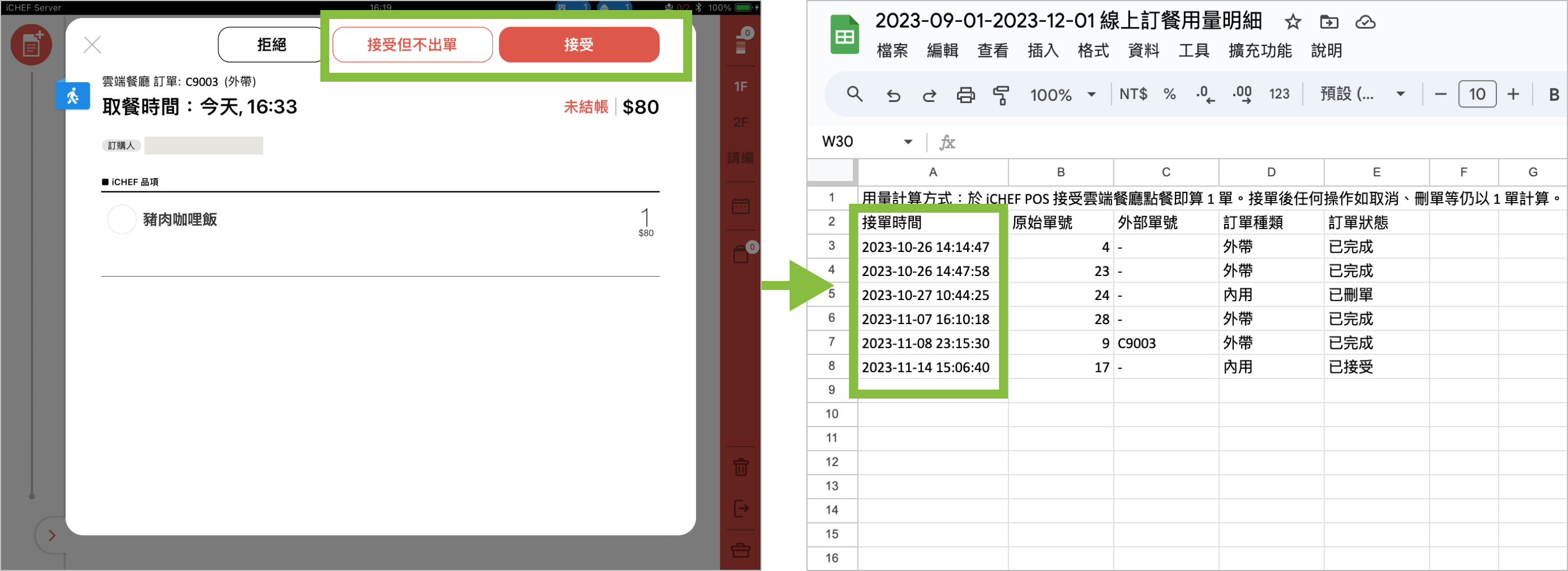 - 接單時間:從 iCHEF POS 點選「接受」的時間。