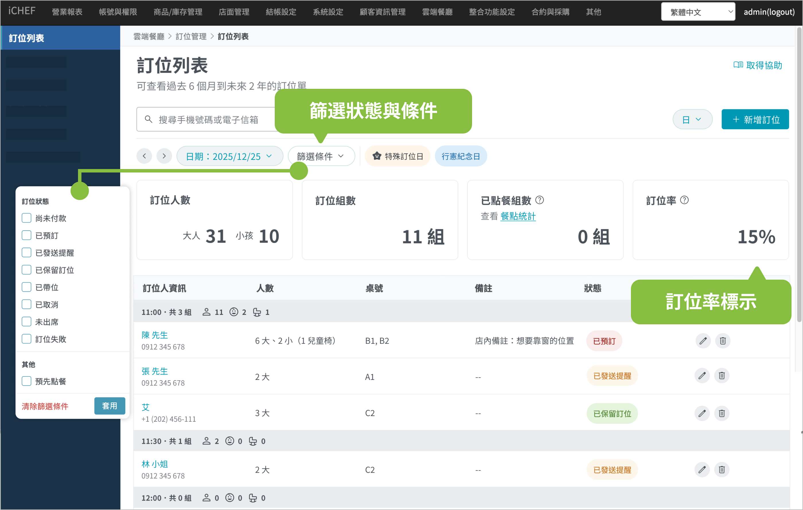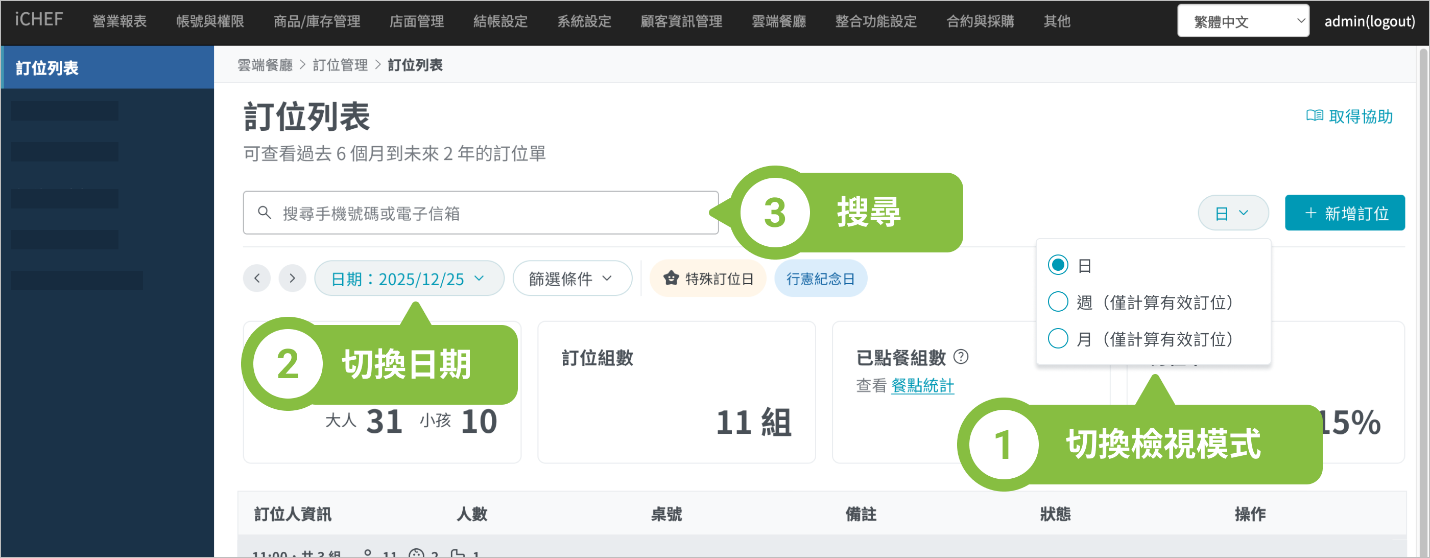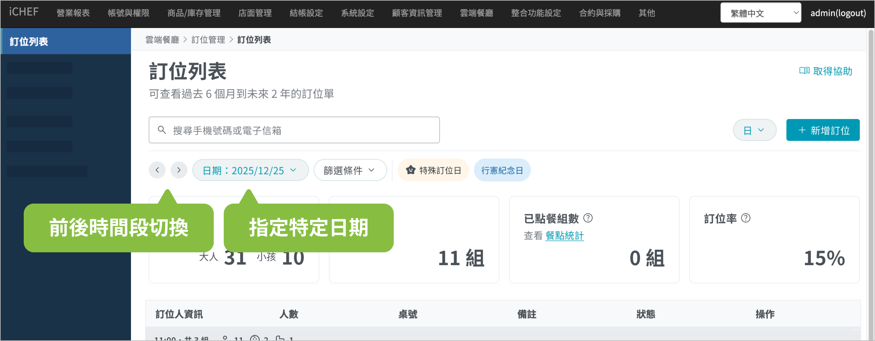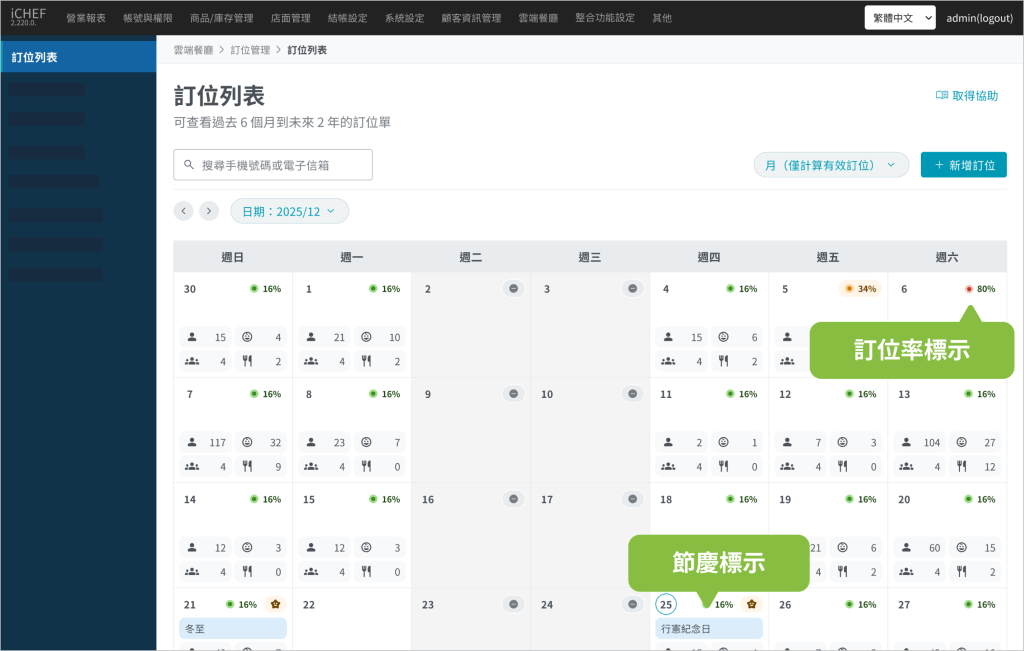 ➤ 後台位置:雲端餐廳 > 訂位管理 > 訂位列表