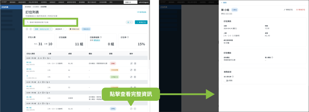 在左上方搜尋欄輸入訂位人的手機號碼或電子信箱,即可查詢過去 6 個月至未來 2 年的訂位記錄。