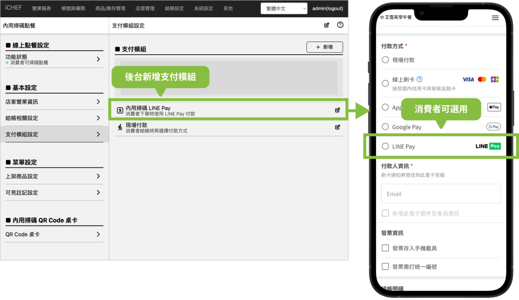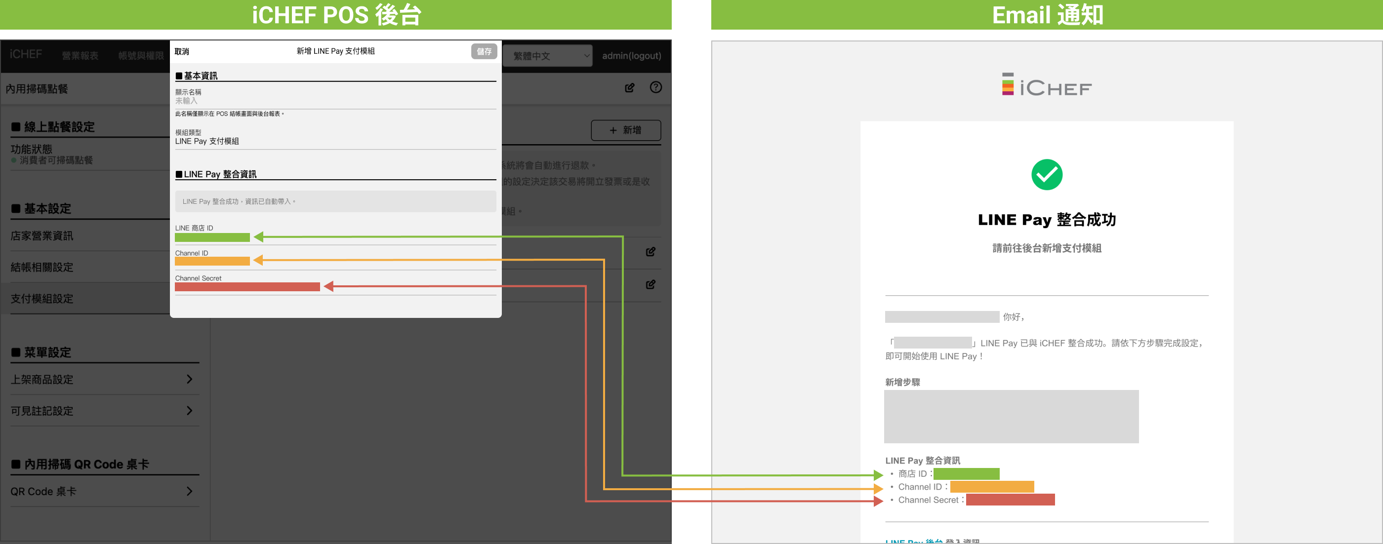 收到「LINE Pay 整合成功」Email,就可以到 iCHEF 後台為內用掃碼點餐新增「LINE Pay 支付模組」。