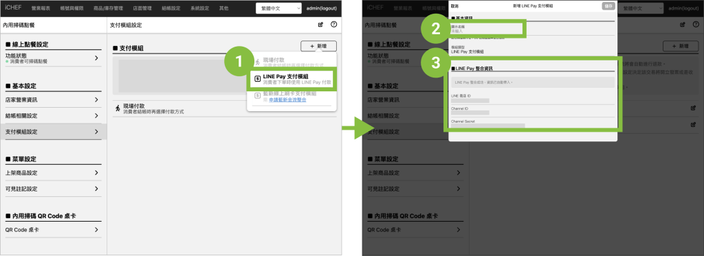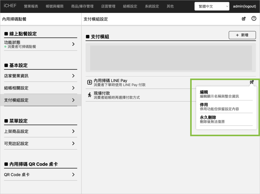 ➤ 後台位置:雲端餐廳 > 內用掃碼點餐 > 支付模組設定
