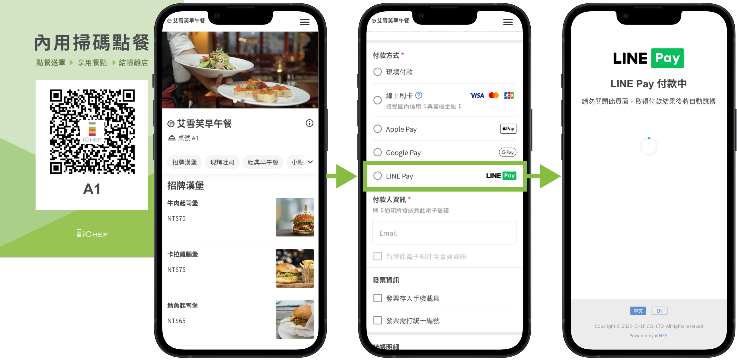 完成設定後,消費者除了可以在座位上自己點餐外,還可以直接在同網頁選擇以 LINE Pay 完成付款,用餐完畢時只要出示網頁畫面即可快速離店,不用再排隊結帳。也能加快你的營運流程,提升店內翻桌率!