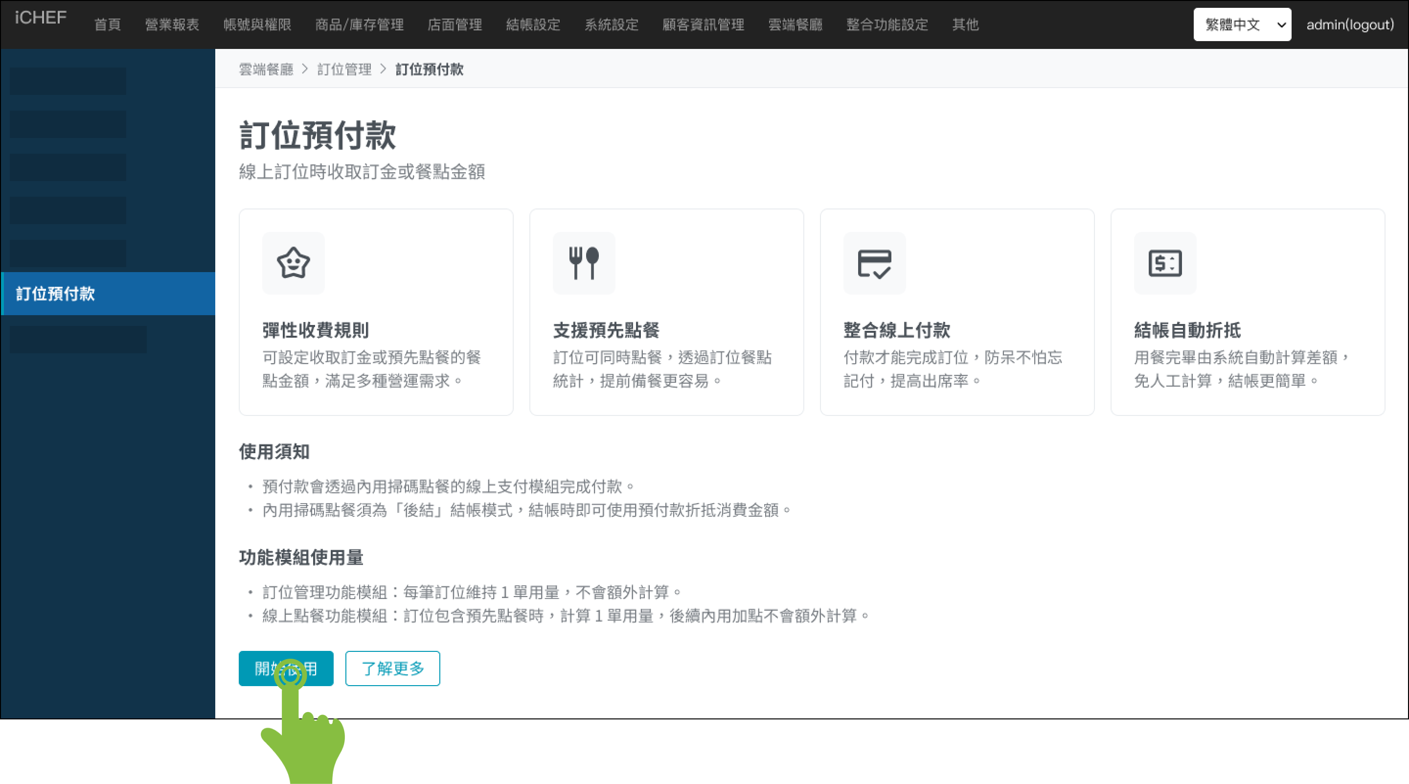訂位預付款屬於 iCHEF 訂位管理的進階功能,須先開啟訂位管理後,才能使用。