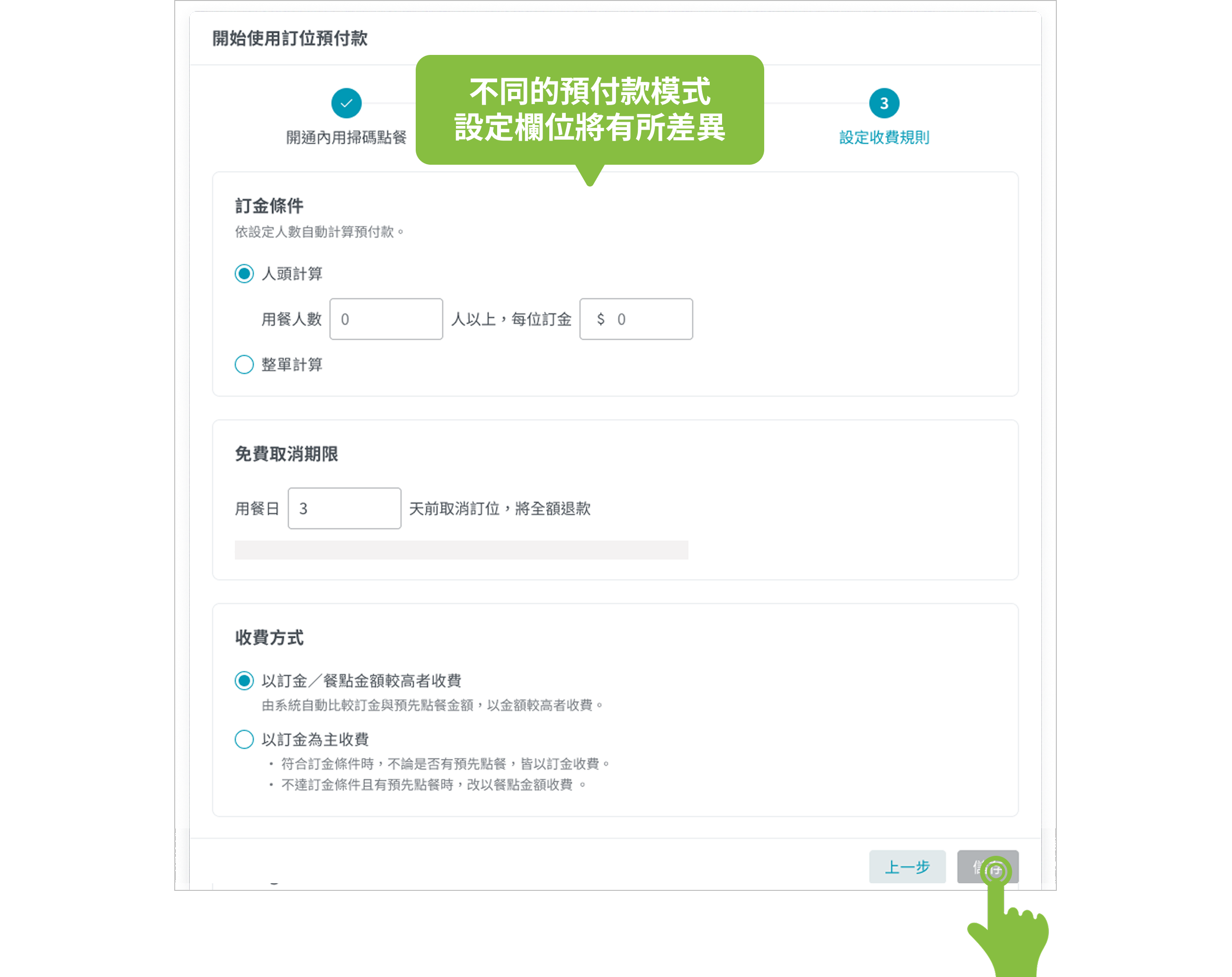 消費者訂位時,預付款金額會依後台設定的規則自動計算。首次使用時,僅要選擇「訂金」、「預先點餐」或「訂金+預先點餐」任一模式,系統都會帶領你完成設定。未來也能回到訂位預付款設定頁,切換模式與調整各項設定。