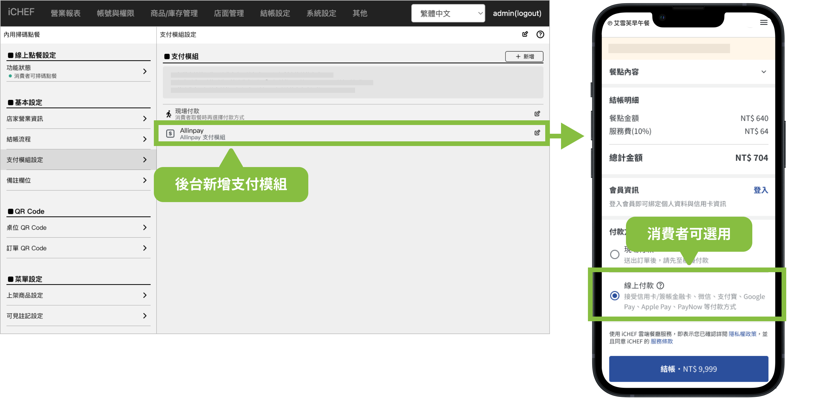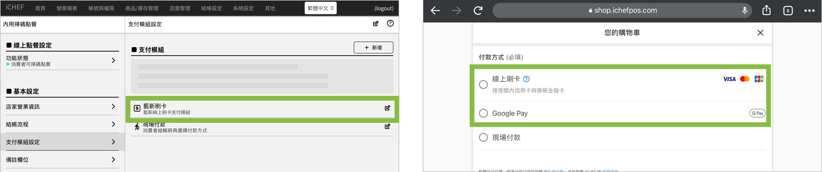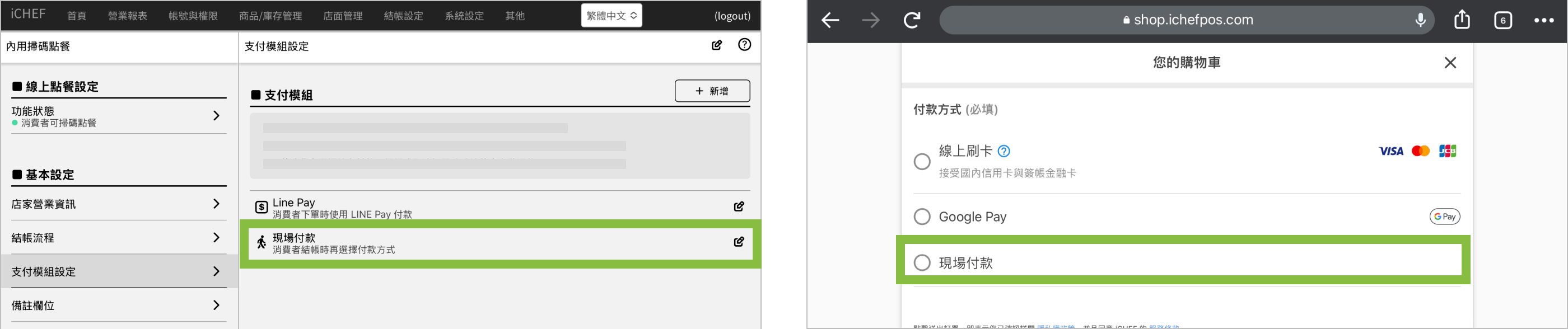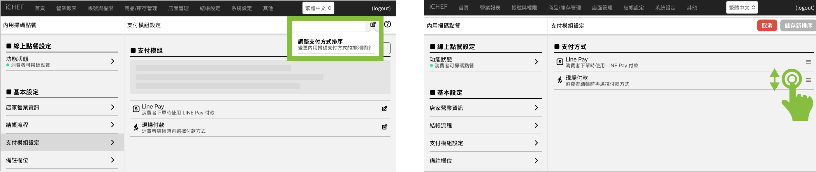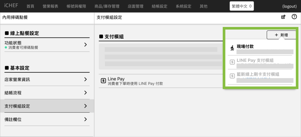 ➤ 後台位置:雲端餐廳 > 內用掃碼點餐 > 支付模組設定