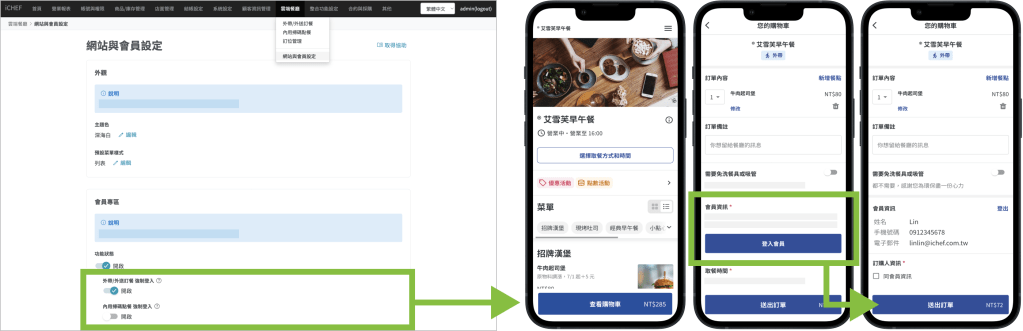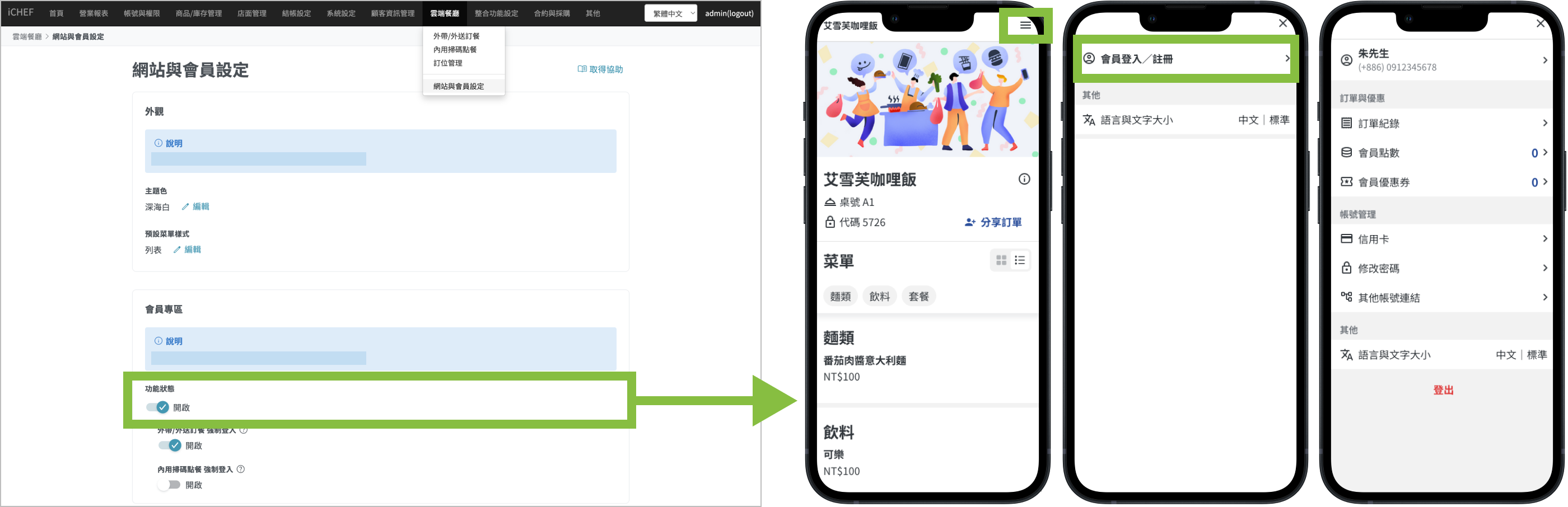 開啟雲端餐廳「會員專區」功能後,將即時更新外帶/外送訂餐、內用掃碼點餐網站。消費者即可線上註冊或登入會員,並同步他的個人資料、消費紀錄、優惠與點數紀錄。
