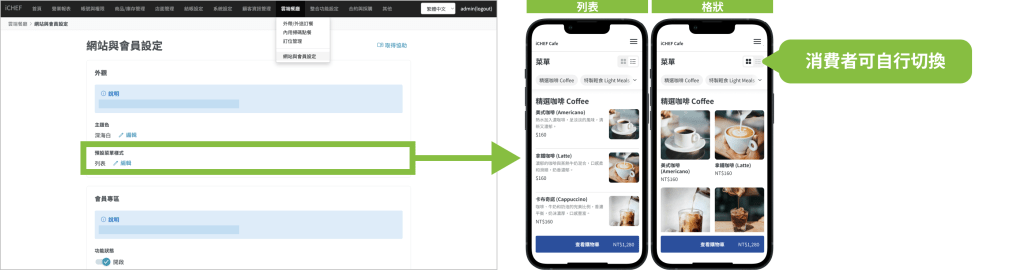 共 2 種樣式,設定後將即時同步到 外帶/外送訂餐、內用掃碼點餐,消費者仍可自由切換樣式瀏覽。