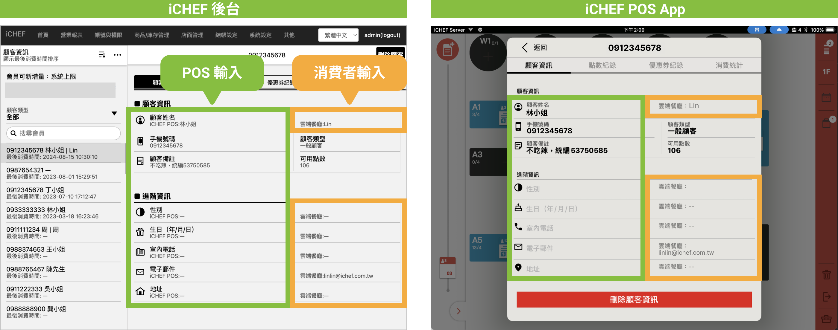 不論是來自現場 iCHEF POS App 或線上雲端餐廳的會員資料,都會彙整在 iCHEF 中。當消費者已經加入過會員,系統會透過「手機號碼」自動比對資料後彙整,你可以在後台或 POS 中查看完整會員資料。