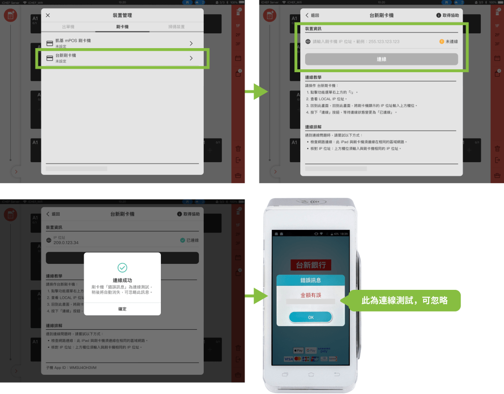 | iCHEF POS App 與刷卡機連線失敗,請依下方說明檢查網路與 IP 位置。 |