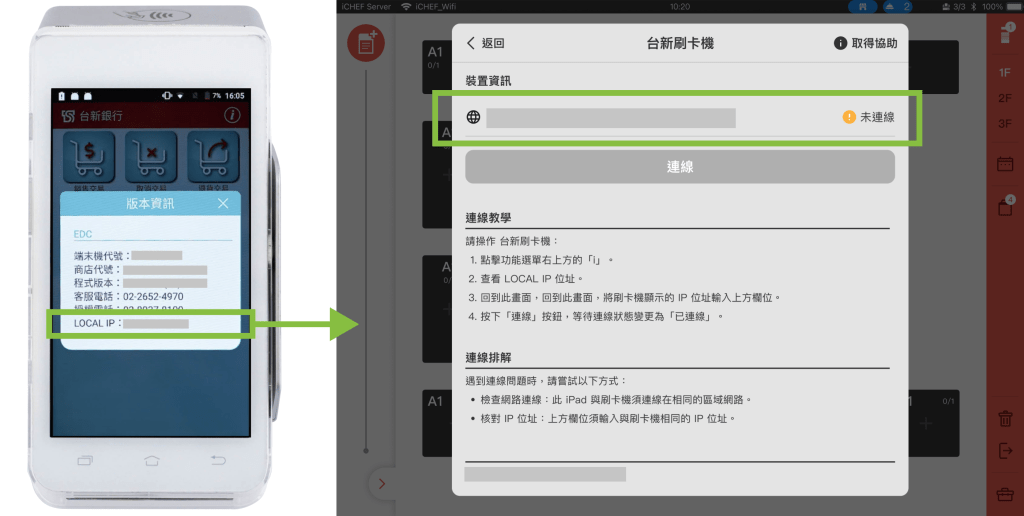核對 IP 位址:iCHEF POS App 連線欄位,須輸入與刷卡機相同的 IP 位址。