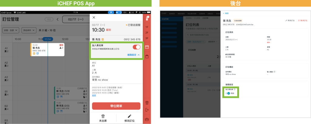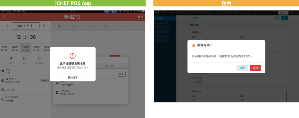 線上訂位黑名單能有效阻擋名單內的手機號碼進行線上訂位。此外,員工從 POS 或後台新增訂位時,會自動比對名單並顯示提示,協助員工作出判斷。