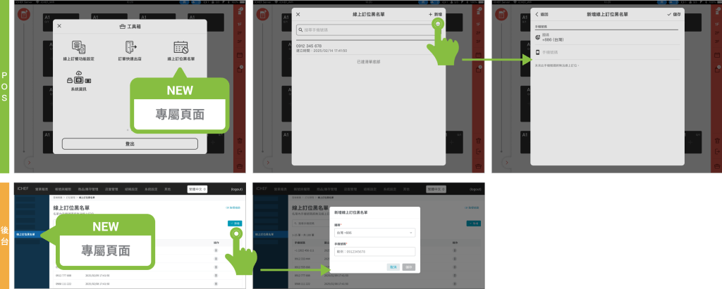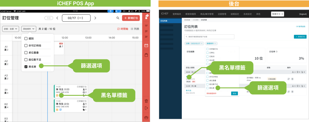 線上訂位黑名單是透過「手機號碼」進行判斷,與「顧客資訊管理」並未連動,且資訊僅顯示於 POS 與後台。