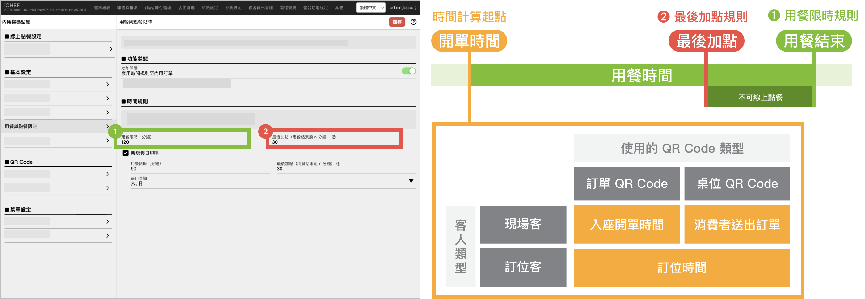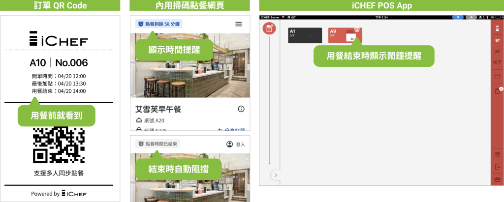 | 用餐限時 | 以開單時間開始計算出「用餐結束」時間 | 訂單 QR Code、點餐網頁、POS 桌位鬧鐘提醒 |