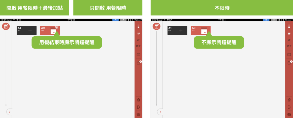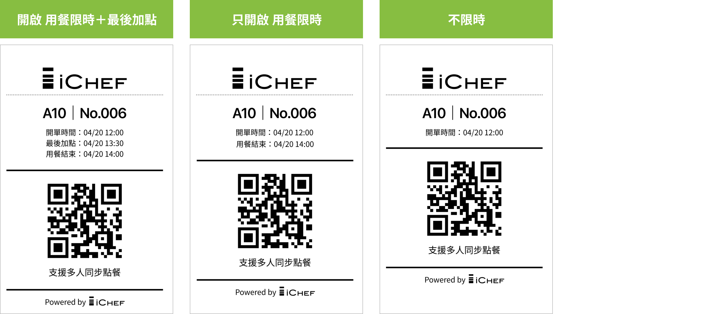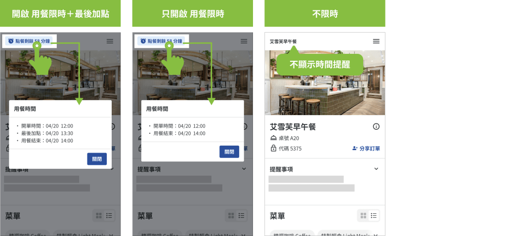 | 顯示資訊/規則設定 | ✅ 用餐限時 ✅ 最後加點 | ✅ 用餐限時 ❌ 最後加點 | ❌ 用餐限時 ❌ 最後加點 |