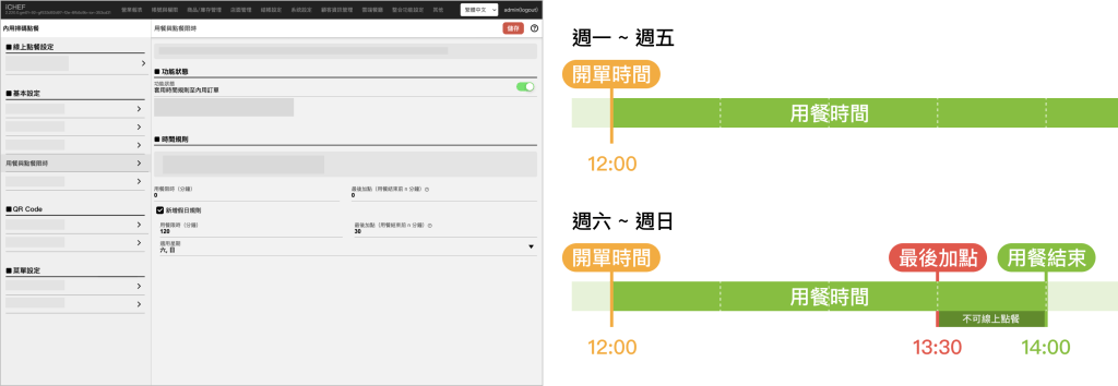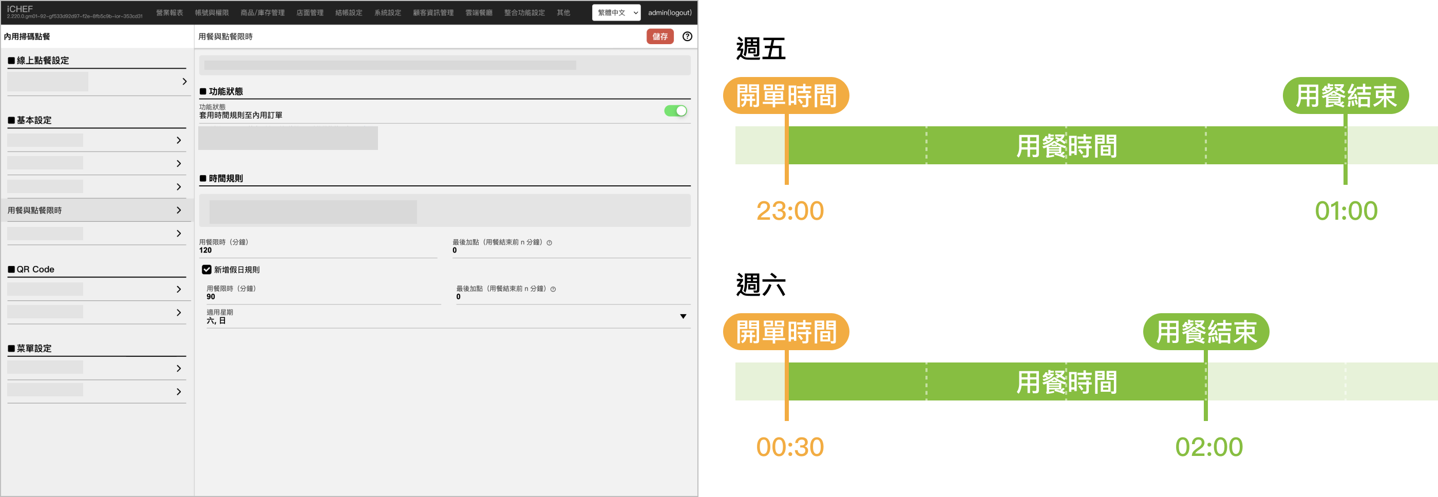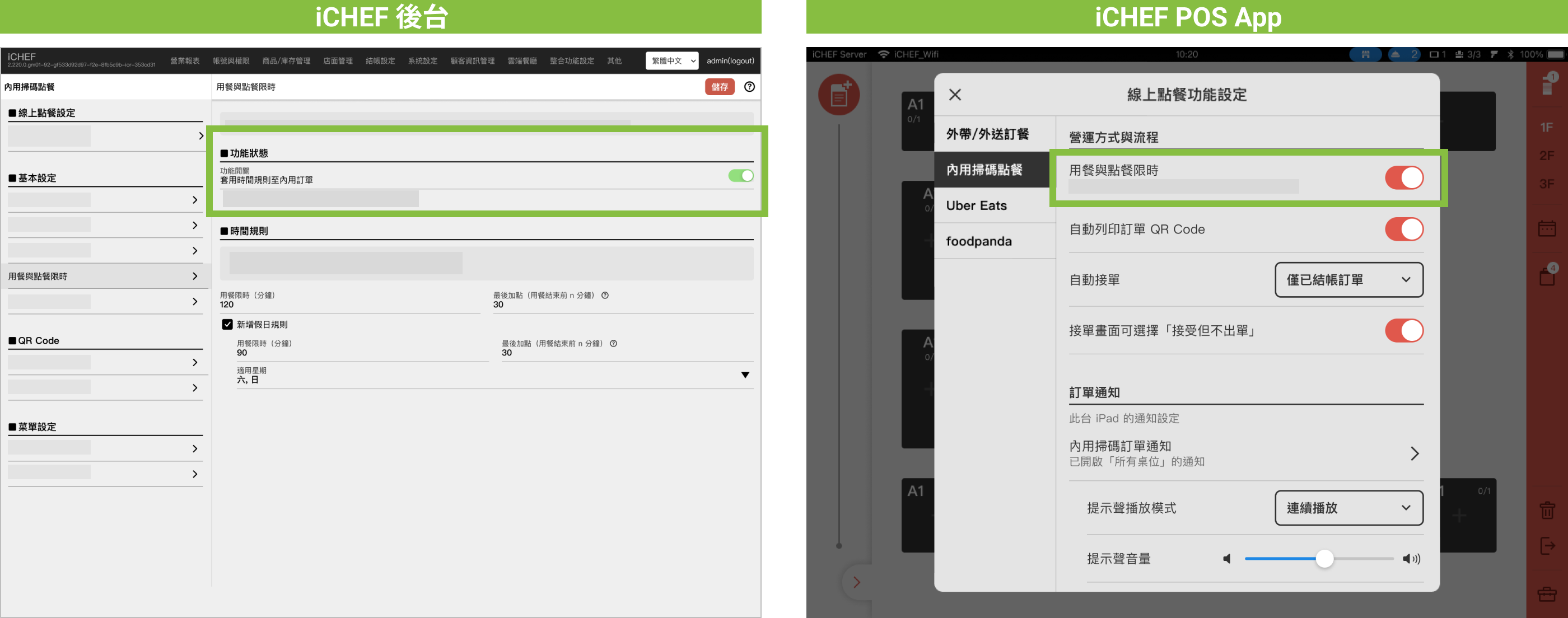 用餐與點餐限時的「時間規則」在 iCHEF 後台設定,「功能狀態」開關則是後台和 POS 都可以同步調整。