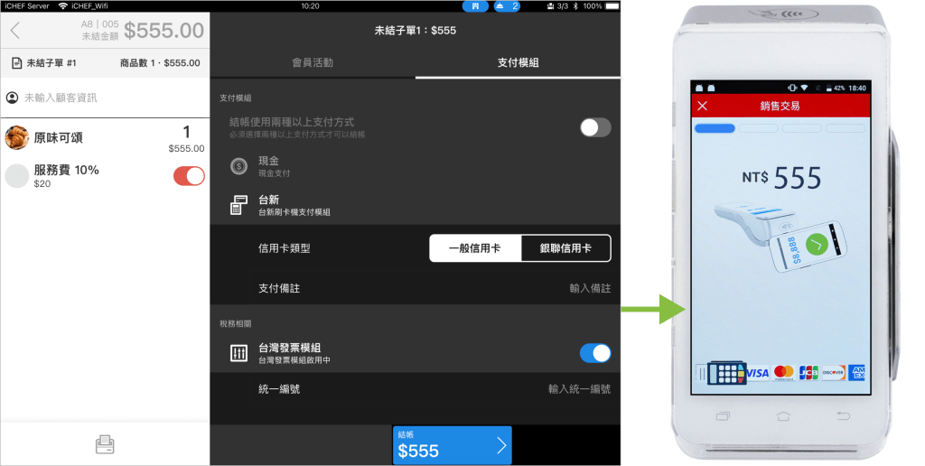 台新刷卡機已和 iCHEF POS 整合。開通此功能即可透過 iCHEF POS 連動台新刷卡機收款,不用額外手動輸入金額,就能完成現場的訂單結帳!