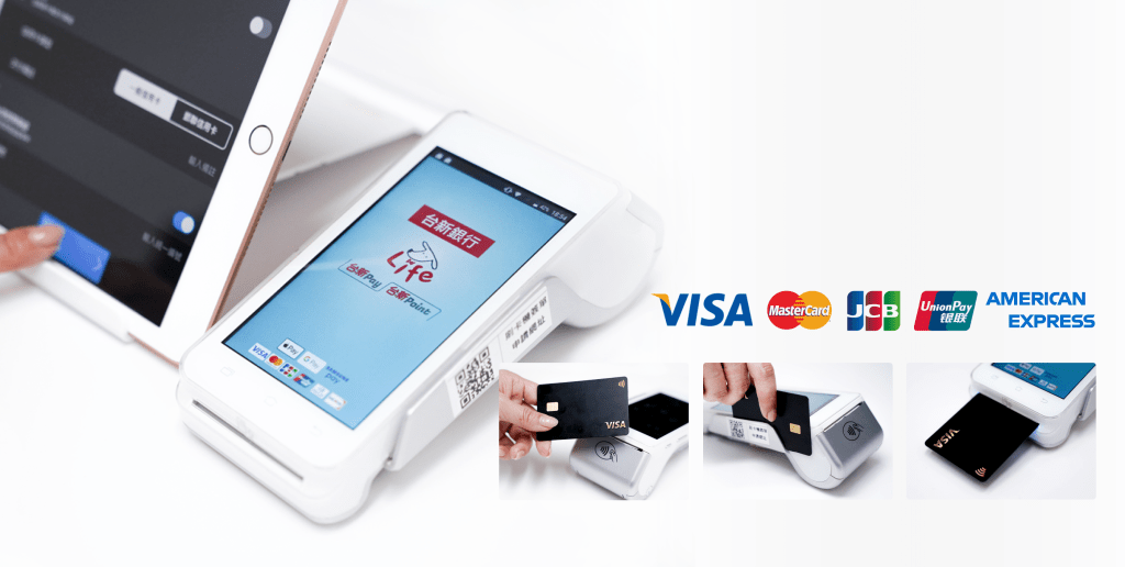 台新刷卡機適用 Visa、MasterCard、JCB、銀聯卡、美國運通卡多種卡別,並支援刷卡、插卡、感應形式收款,服務方式更多元。
