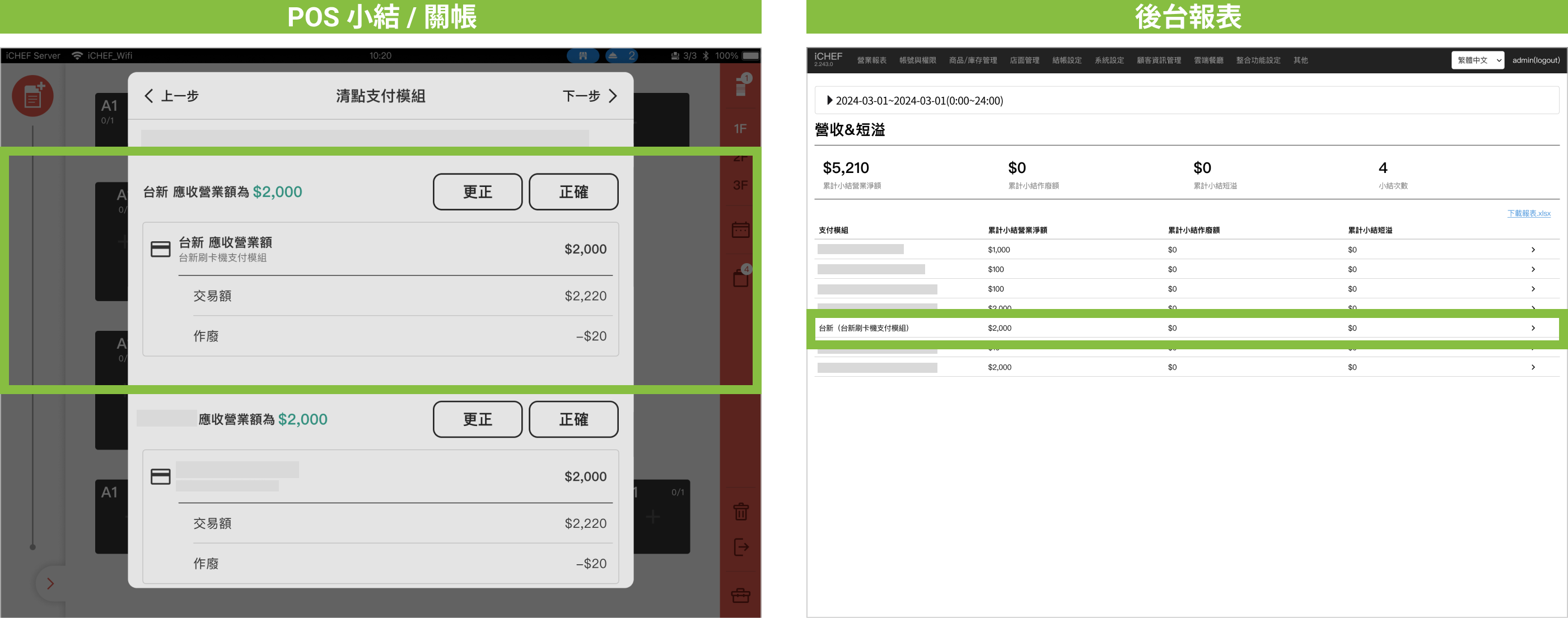 不論是在每日的小結、關帳,或是後台的報表,iCHEF 都為台新刷卡機設置了專屬的區塊,讓你更快掌握來自 台新刷卡機的交易額,輕鬆對帳。