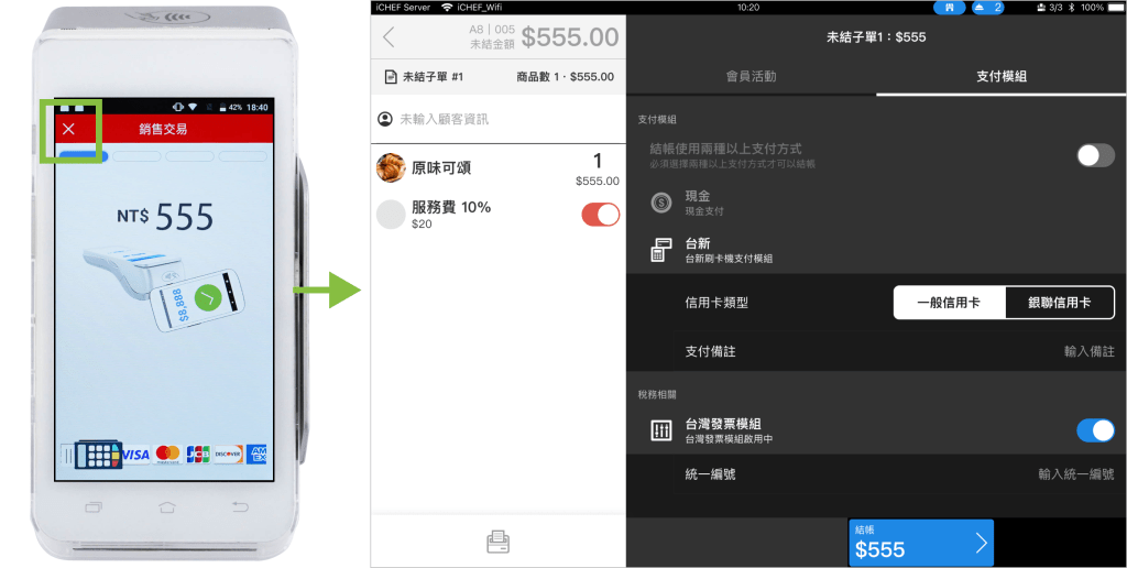 將台新刷卡機與 iCHEF POS 完成連線後,結帳時選擇「台新刷卡機支付模組」系統就會連動刷卡機收款,不用額外手動輸入金額,就能完成結帳。