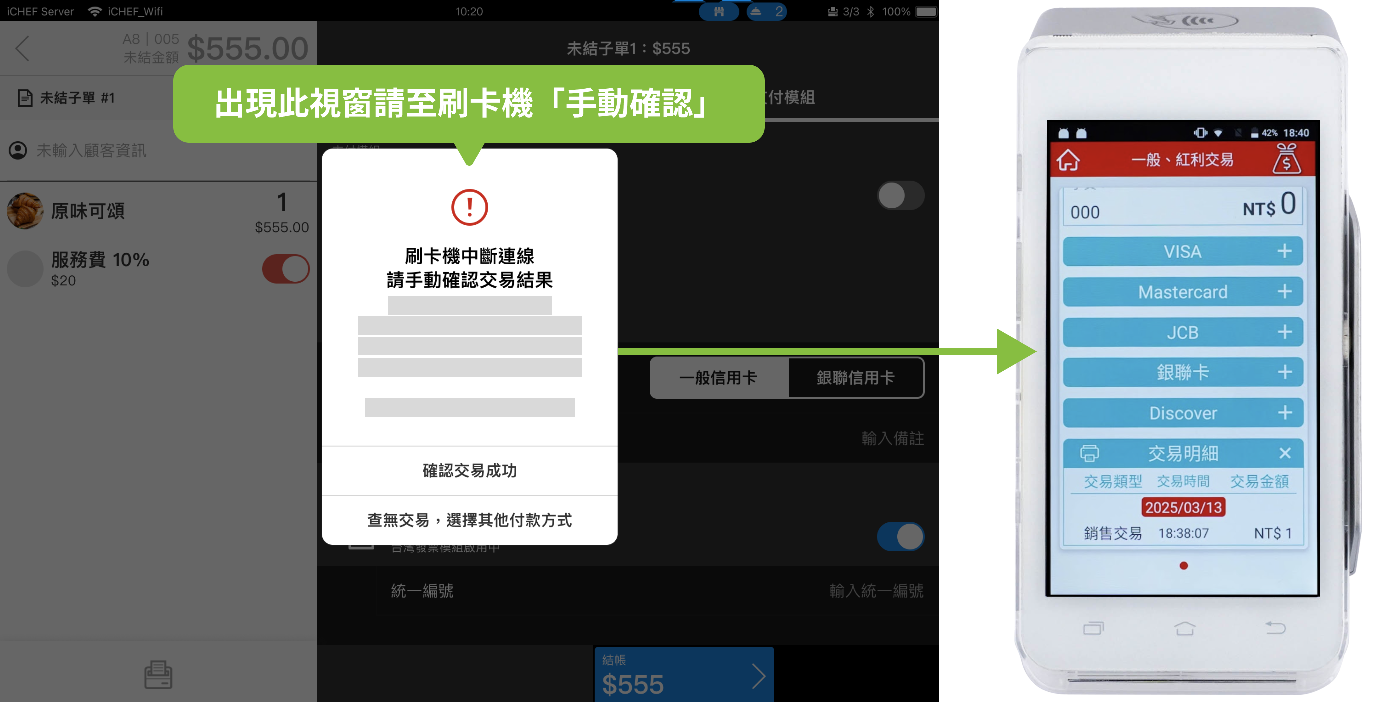 當結帳出現下圖視窗時,請務必在 iCHEF POS App 透過「手動確認」的方式,直接從刷卡機查詢後,回 iCHEF POS App 確認並完成結帳。