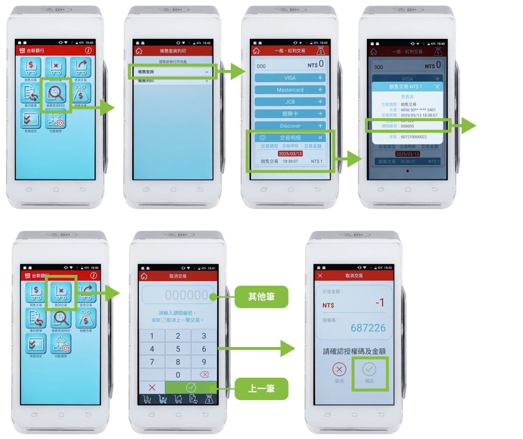 若為手動確認的交易,作廢須操作台新刷卡機,步驟如下: