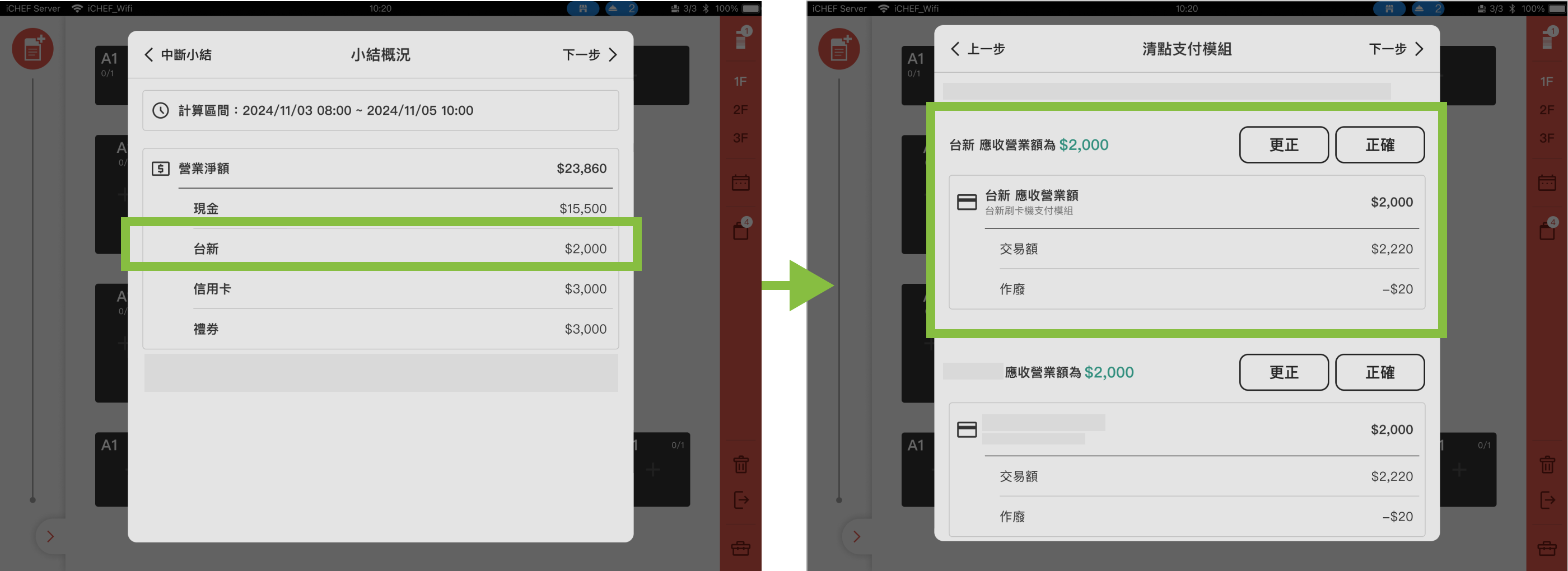 在 iCHEF POS App 小結/關帳時,可至台新刷卡機查詢實際收款金額,完成帳務清點。