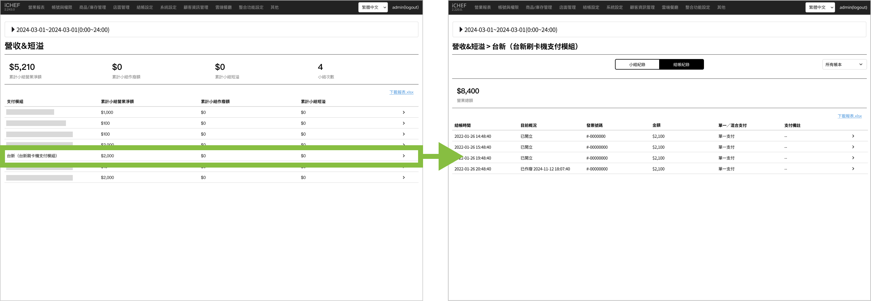 當完成 iCHEF POS App 小結後,你可以在 營業報表 > 營收&短溢 直接查看台新刷卡機支付模組的交易紀錄彙整。