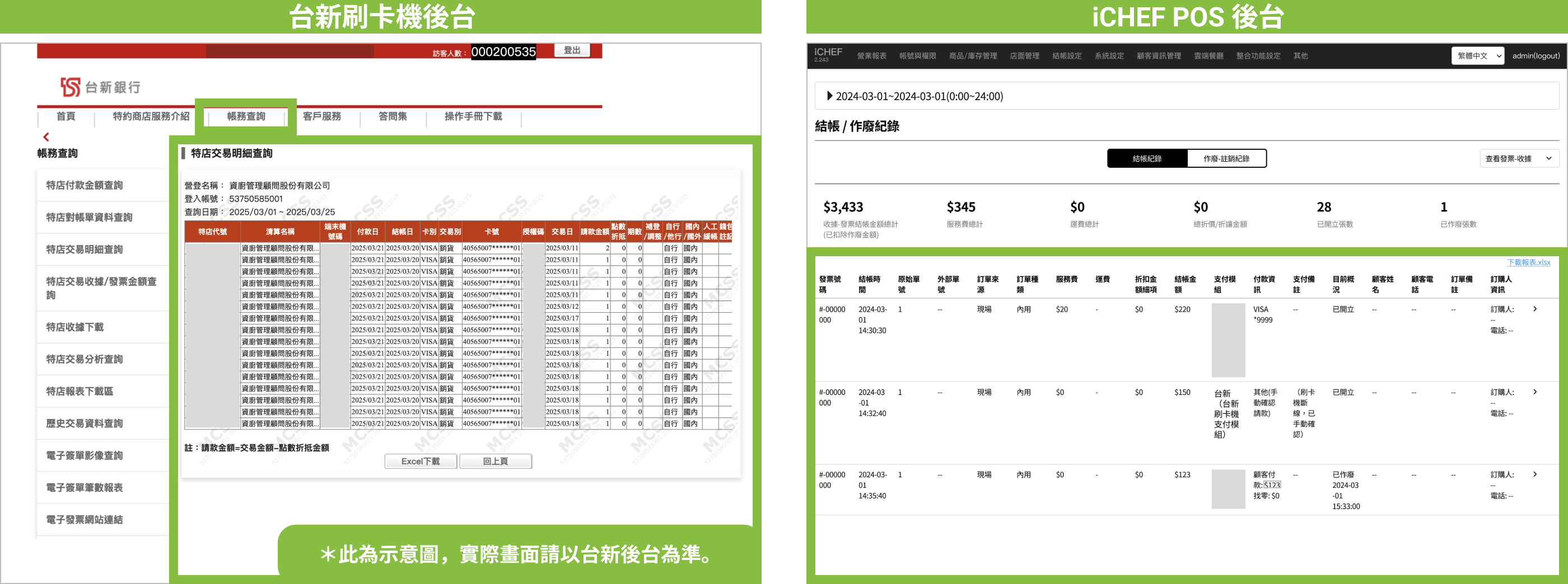 若總金額出現短溢時,請比對台新刷卡後台與 iCHEF POS 後台報表的單筆交易紀錄。