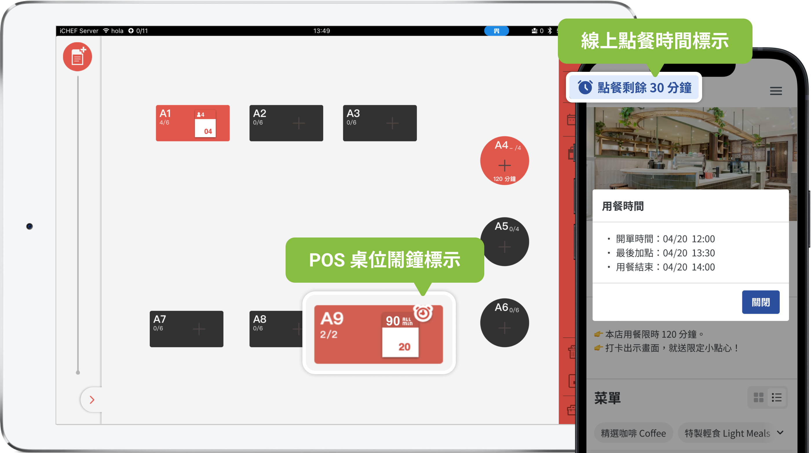 有 iCHEF POS 就能用!開啟桌況頁的「店內滯留時間警示」,依據店內營運模式,用途由你決定,時間到就自動在桌位標示鬧鐘,讓前台人員更容易辨識。