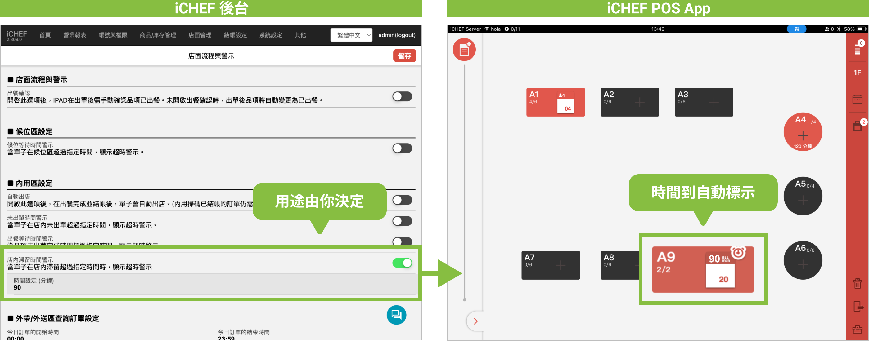 開啟此功能時,用餐限時將取代上方的「店內滯留時間警示」時間設定,在用餐時間結束時,桌位自動標示鬧鐘。